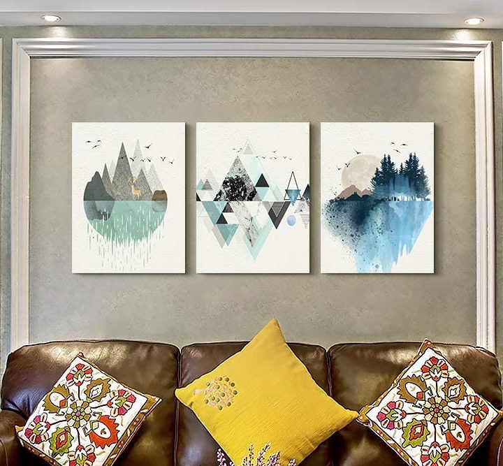 Bold and stimulating, MHARTK66’s abstract geometric wall art depicts three natural scenes on separate canvas panels. Mountain lakesides and overhead birds are the principal subjects painted in cool tones of grays, greens, and blues. Each print measures 12 inches wide by 16 inches tall.