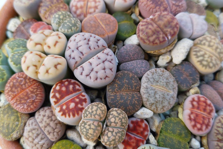 This plant is called living stone for good reason and is native to southern Africa. The plant looks like stones or pebbles and comes in shades of green, gray, rust, green, brown, and sometimes pink. Living Stone plants are small enough to grow on a windowsill or patio table, and a collection of varying colored ones will surely spark a conversation with your guests.
