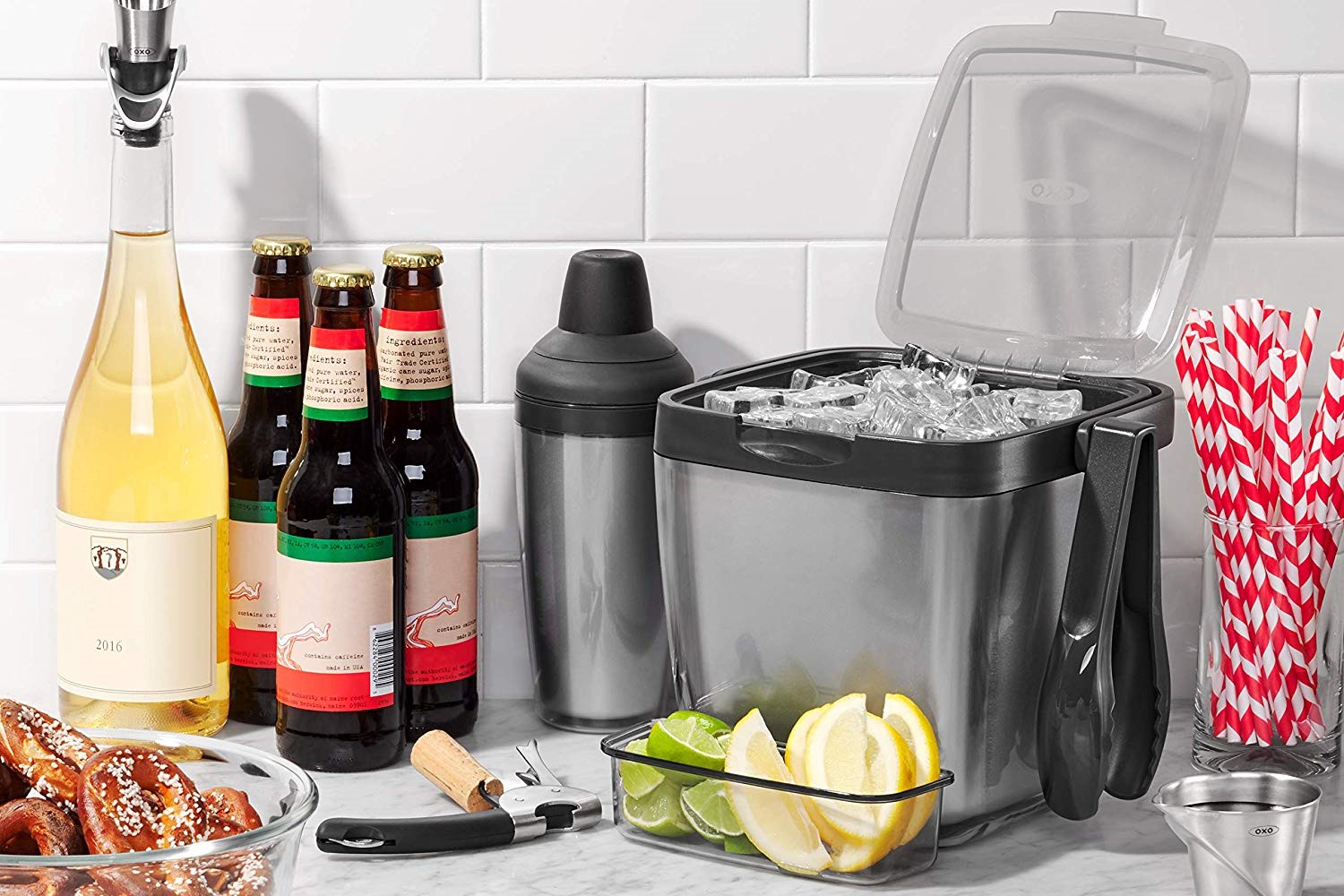 Take the party outdoors with the OXO Good Grips Ice Bucket. Featuring double-wall insulation and a meltwater reservoir, this is the perfect solution for barbecues, tailgates, or picnics. Its convenient carrying handle and nylon tongs give this bucket the portability you need to keep your ice frozen anywhere you go.
