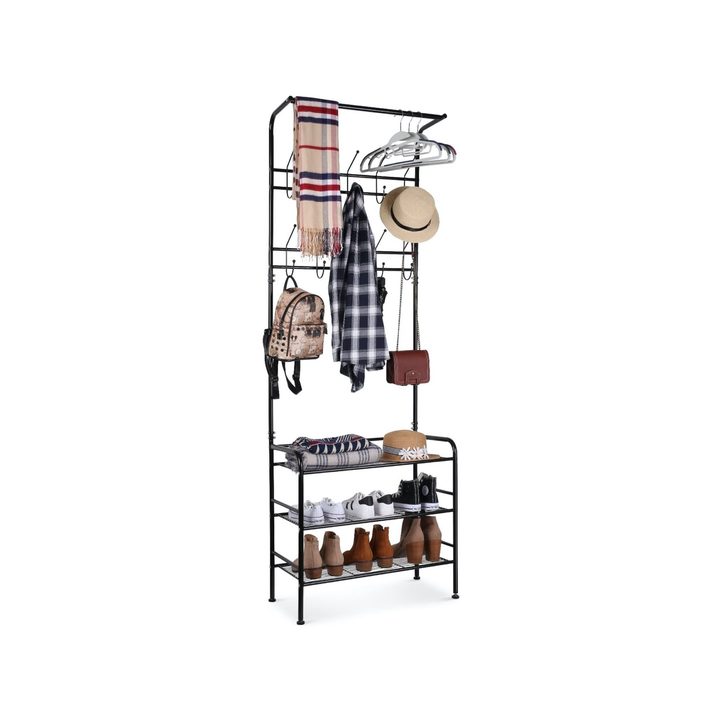 With a minimalist design and a modern look, the Homfa Metal Entryway Coat Shoe Rack is an excellent budget solution for your storage and organization needs. Made from iron metal, it is a durable garment rack that features 20 hooks and three shelves for your shoes or other items.