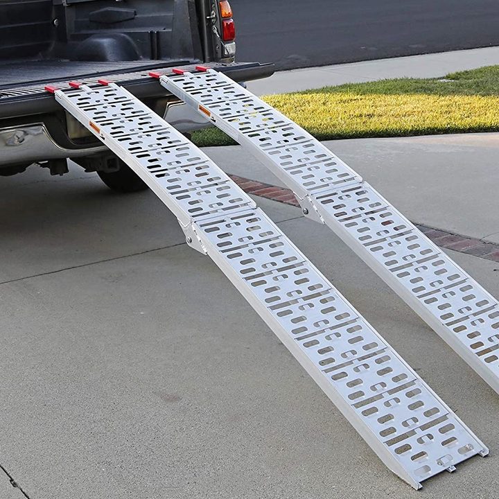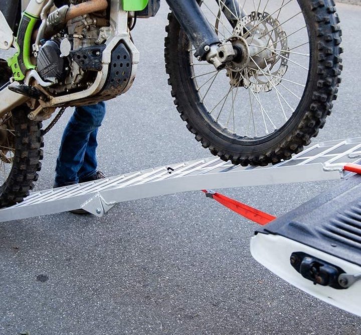 Transporting your bike safely doesn’t have to cost you an arm and a leg, that’s why we recommend the super budget-friendly Pit Posse Folding Motorcycle Ramp. This single foldable loading ramp is super durable, compact, and ready to store. Made of weather- and rust-resistant aluminum, it will hold up to 750 pounds of weight.
