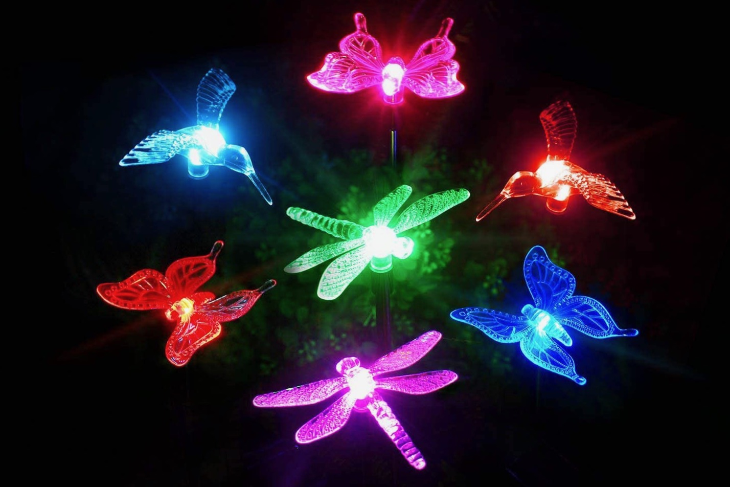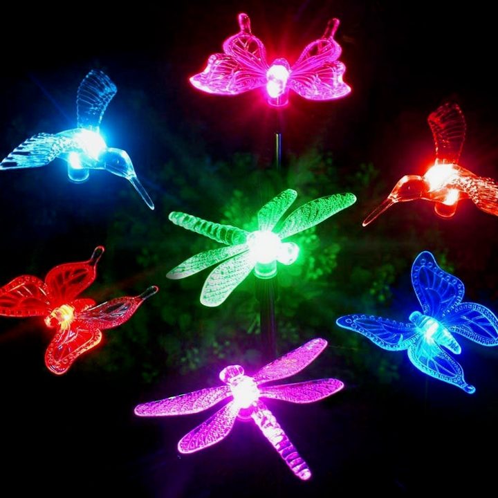 When it comes to aesthetic garden stakes, OxyLED provides the best decorative option. One pack comes with three solar-powered lights. Each stake is topped with either a light-up or color-changing dragonfly, bird, or butterfly that lasts for up to eight hours at night.