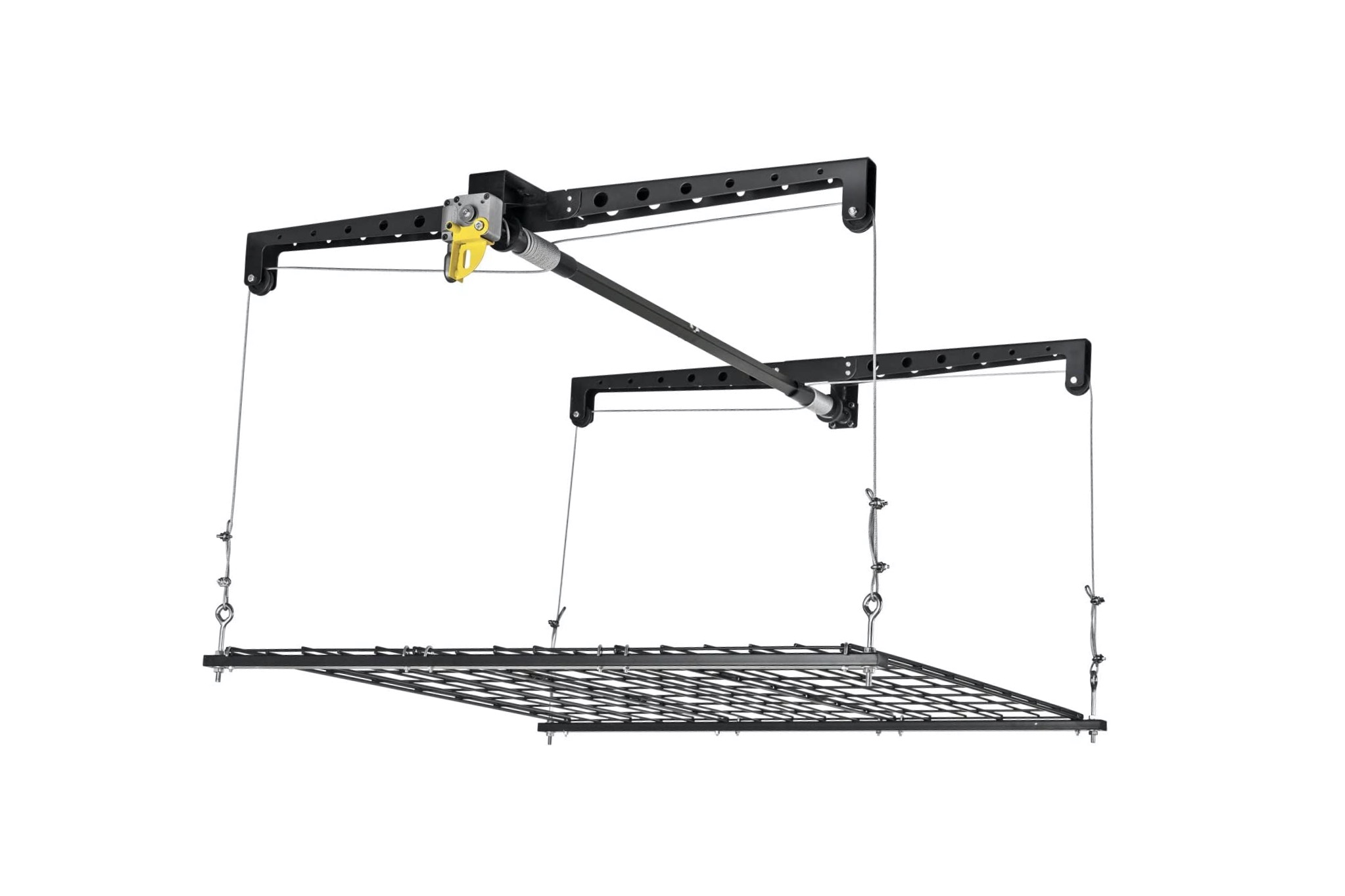Reclaim your garage floor space with the adjustable Racor Garage Ceiling Storage Rack Lift. Built with nylon rings, this durable solution can mount to any ceiling and adjusts to angled constructions to provide efficient storage. The crank system in this storage rack allows you to lower and raise the shelf for maximum versatility.