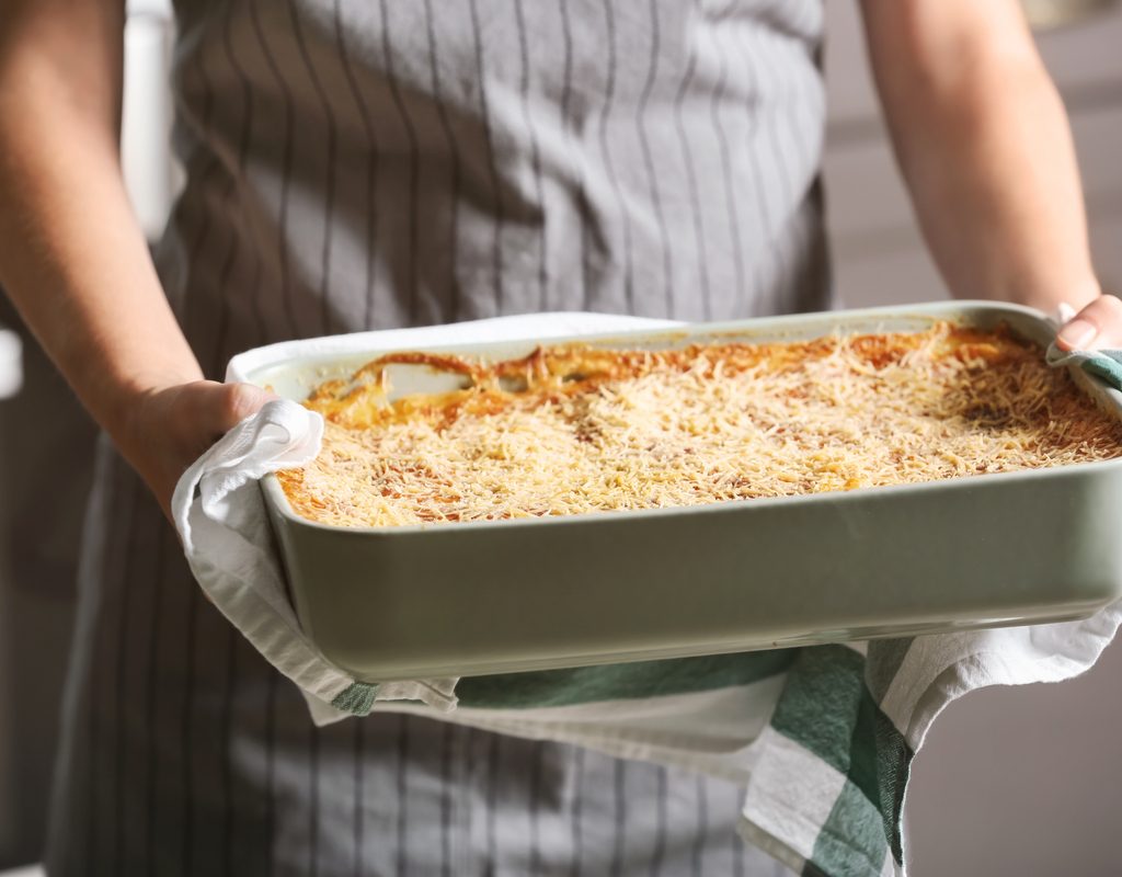 “Lasagne,” with an “e” at the end, is the plural word that refers to the actual pasta noodles used in the cheesy, saucy recipe we call “lasagna,” an Italian staple dating back to the Middle Ages. The various regions of Italy each have their own unique spin on this pasta classic, with the variety from Naples featuring local sausage, fried meatballs, and hard-boiled eggs served layered with ricotta and mozzarella and topped with a meaty ragu sauce. In Bologna, the lasagne pasta is green, thanks to spinach or other green vegetables mixed into the dough. Some modern variations eliminate the meat entirely and use sautéed vegetables and tomato sauce within the warm layers. The one thing that is consistent with all lasagna recipes is that they are ultimately baked in the oven.