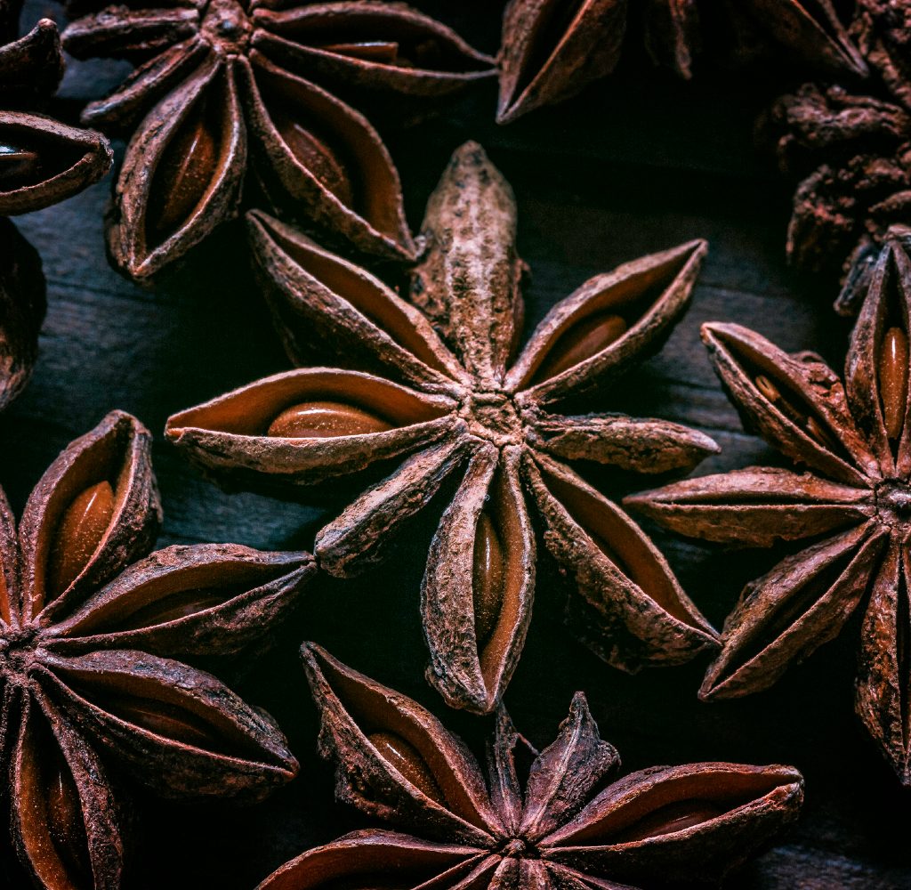 The spice is also used to flavor liqueurs such as absinthe, sambuca, and pastis and baked goods like cakes and cookies. The flavors of anise pair well with citrus, onions, poultry, beef, cinnamon, ginger, and nutmeg. Whether you use anise seeds or whole pods will depend on the dish – whole pods can be added to sauces, soups, and marinades and then removed before serving. The ground version of either the pods or seeds can be added to dishes as you would any other spice. Try using anise on a braised pork belly or add a pinch to a pumpkin pie or gingerbread cookies.