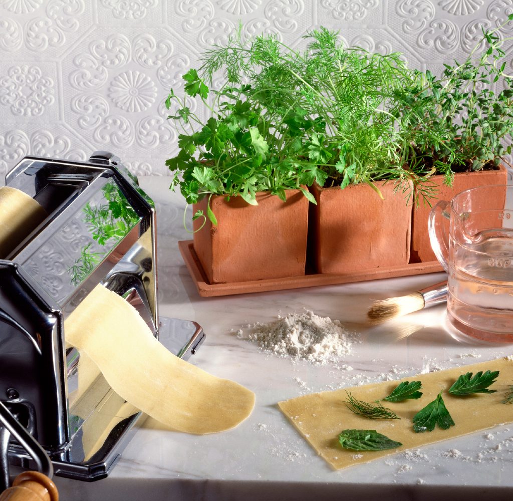 If you have a good amount of natural light in your kitchen, either in a window sill or otherwise, you can grow herbs in small pots with little effort. (If you do place your plants in a window sill, be sure the temperature doesn’t get too cold in the cooler months.) When choosing containers, be sure to pick pots with drains and saucers as proper drainage is crucial. If you only have sealed pots on hand and don’t want to purchase new ones with drains and saucers, place small rocks at the base of the container and add some vermiculite to the soil to promote proper drainage.