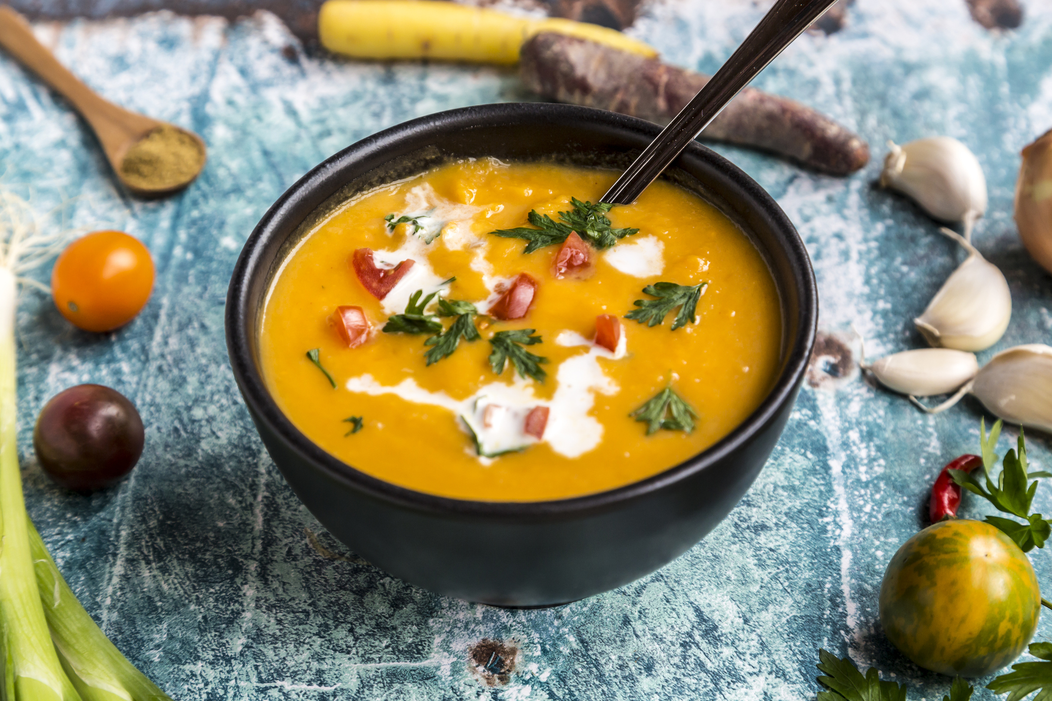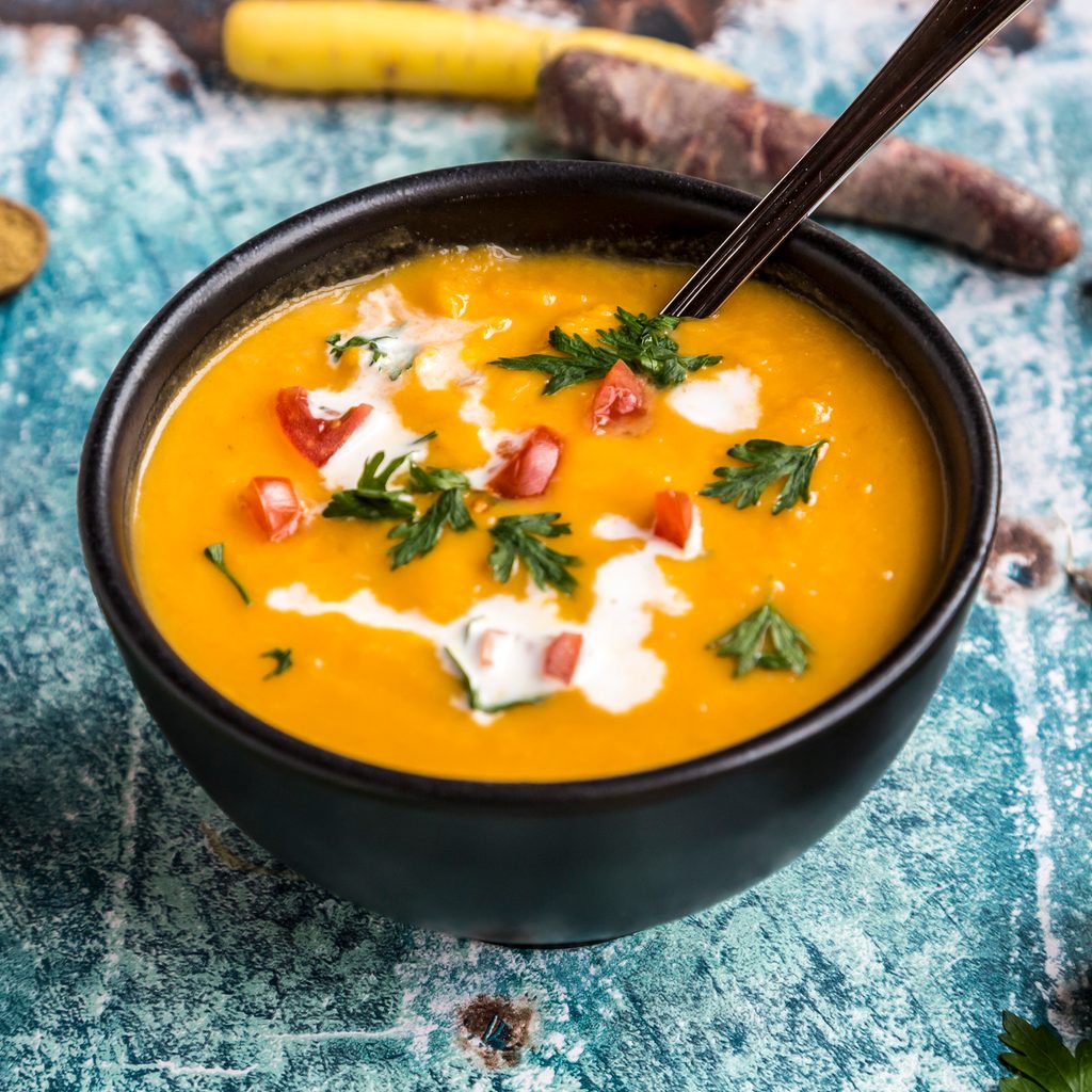 Hearty, savory soups are not just for winter. This sweet potato soup is the perfect combination of creamy sweet potatoes, carrots, fresh ginger, and a hint of spice. Add a swirl of coconut cream, watercress, and chopped pistachios on top for an out-of-this-world weeknight meal. Prep it in 10 minutes and simmer it for 30; at just 254 calories per serving, it’s fine to have seconds!