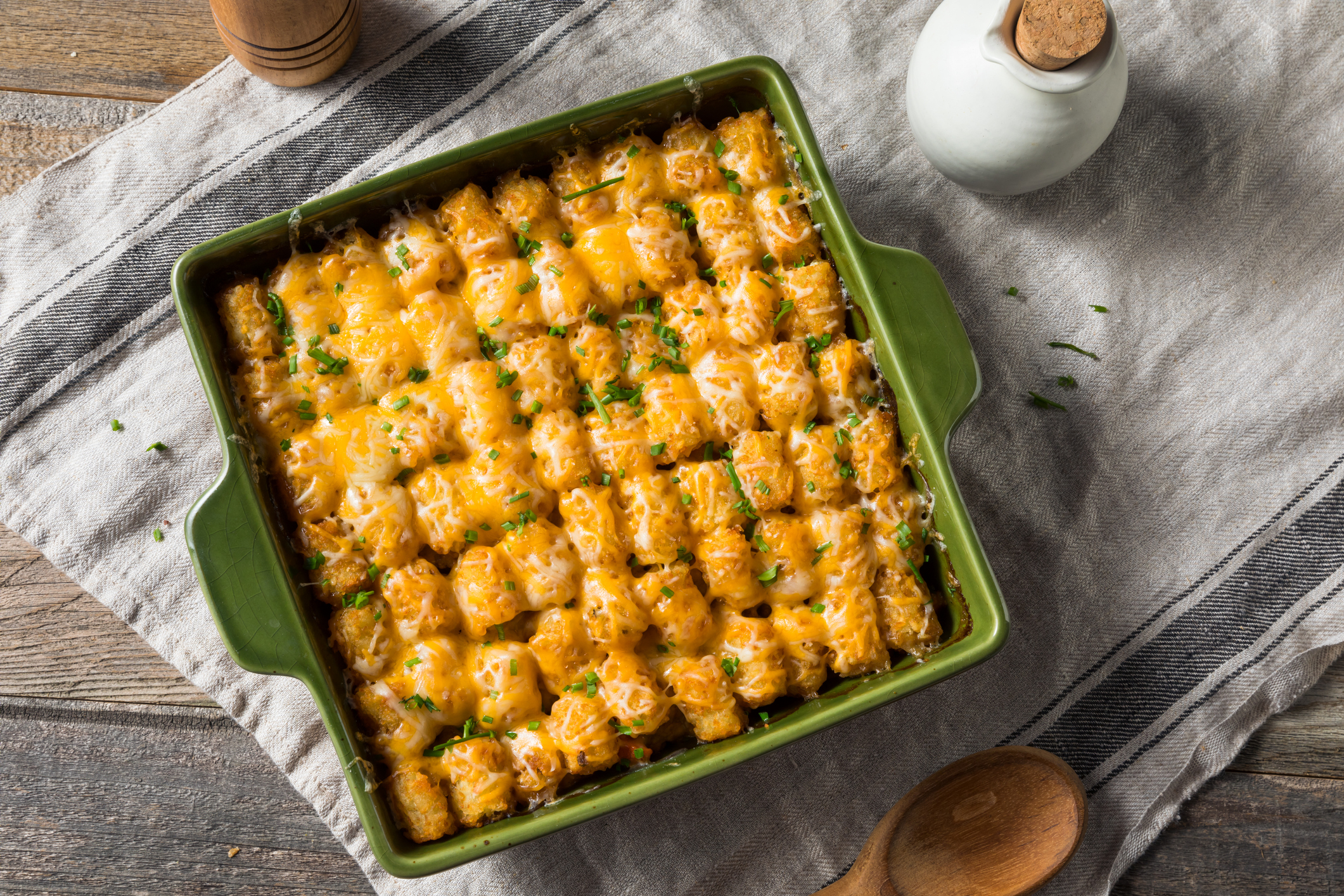 Whether or not you’re a vegetarian, this recipe is a crazy-good combination of tater tots, mushroom soup, and cheese that will put your tastebuds into overdrive. If you make just one tater tot casserole recipe in your life, this should be it!