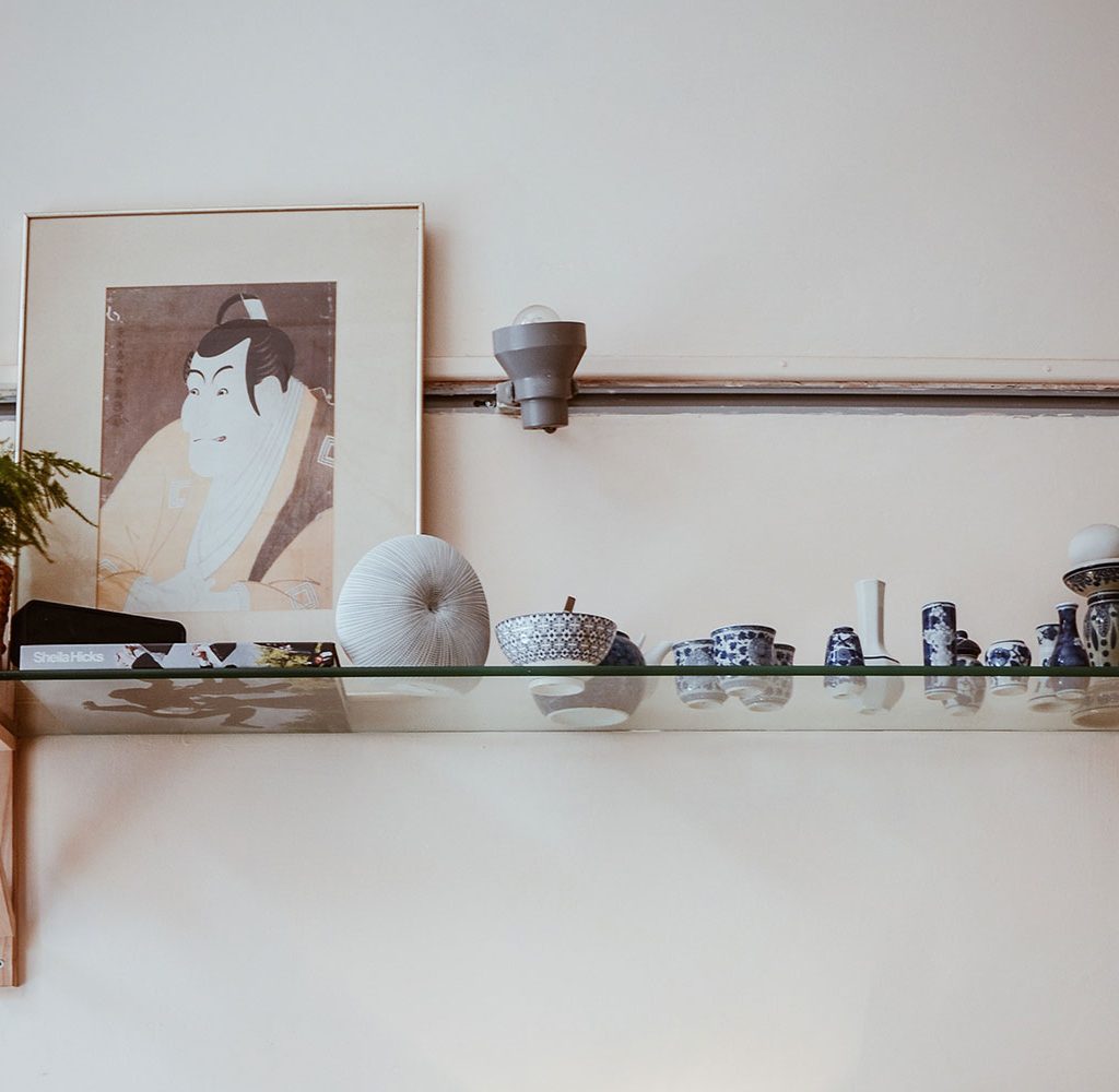 Shelving is always going to be easier than hanging art. Install floating ledge shelves on your walls in two rows, leaving enough space for larger pieces of art. Layer frames on the shelf, varying heights, and creating depth.