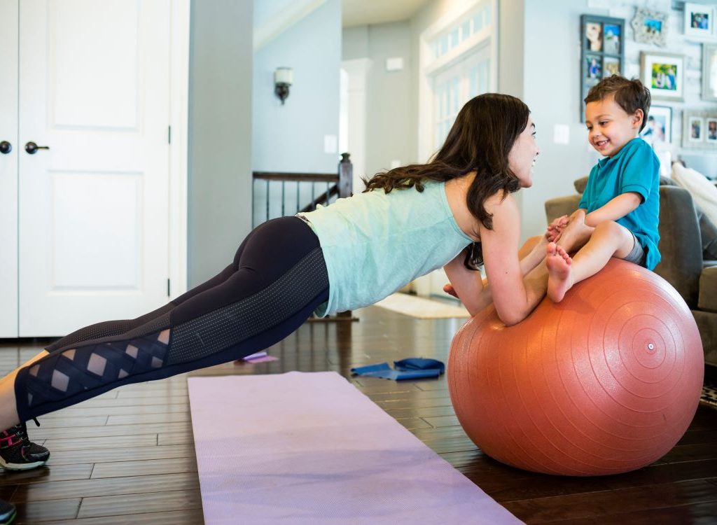 If your toddler’s Pack n Play (or other type of playpen) still works for them, try it, or get out the wind-up baby swing, or plush baby rocker, — or anything that can hold them safely in one place while you move around. Give them some of their favorite puzzles and toys. Of course, the minute they see you working out, they’ll probably want out, too — but you can try. From here you can jog around the room, flip on the treadmill, or join in a bonafide ballerina workout like this livestreamed customized class from world-renowned Mary Helen Bowers.