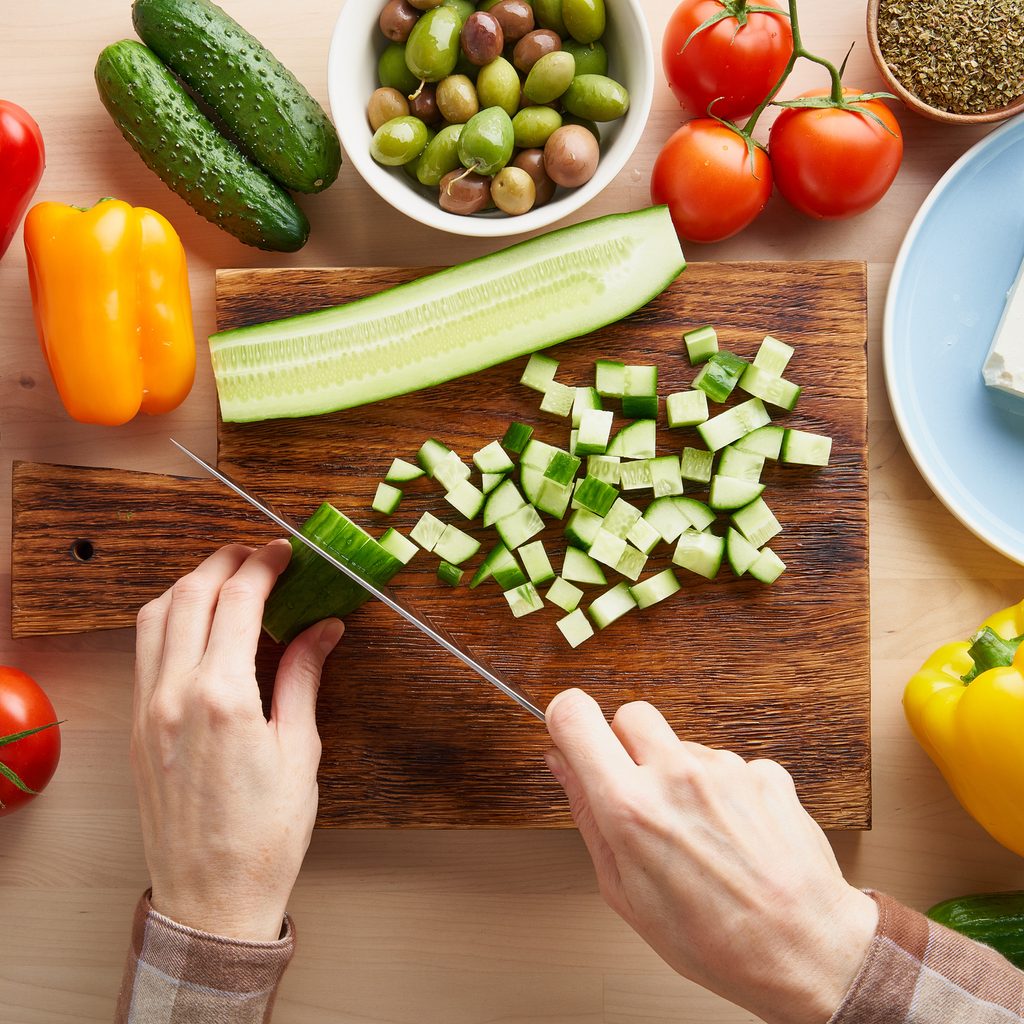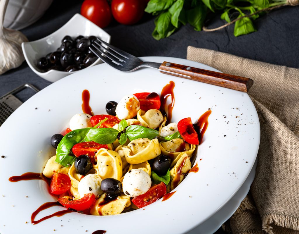 You can get creative and use the fresh produce and ingredients that you have on hand. For authentic Mediterranean flair for your pasta salad, be sure to include something salty, some crunchy veggies, and the sweet juiciness of ripe tomatoes.