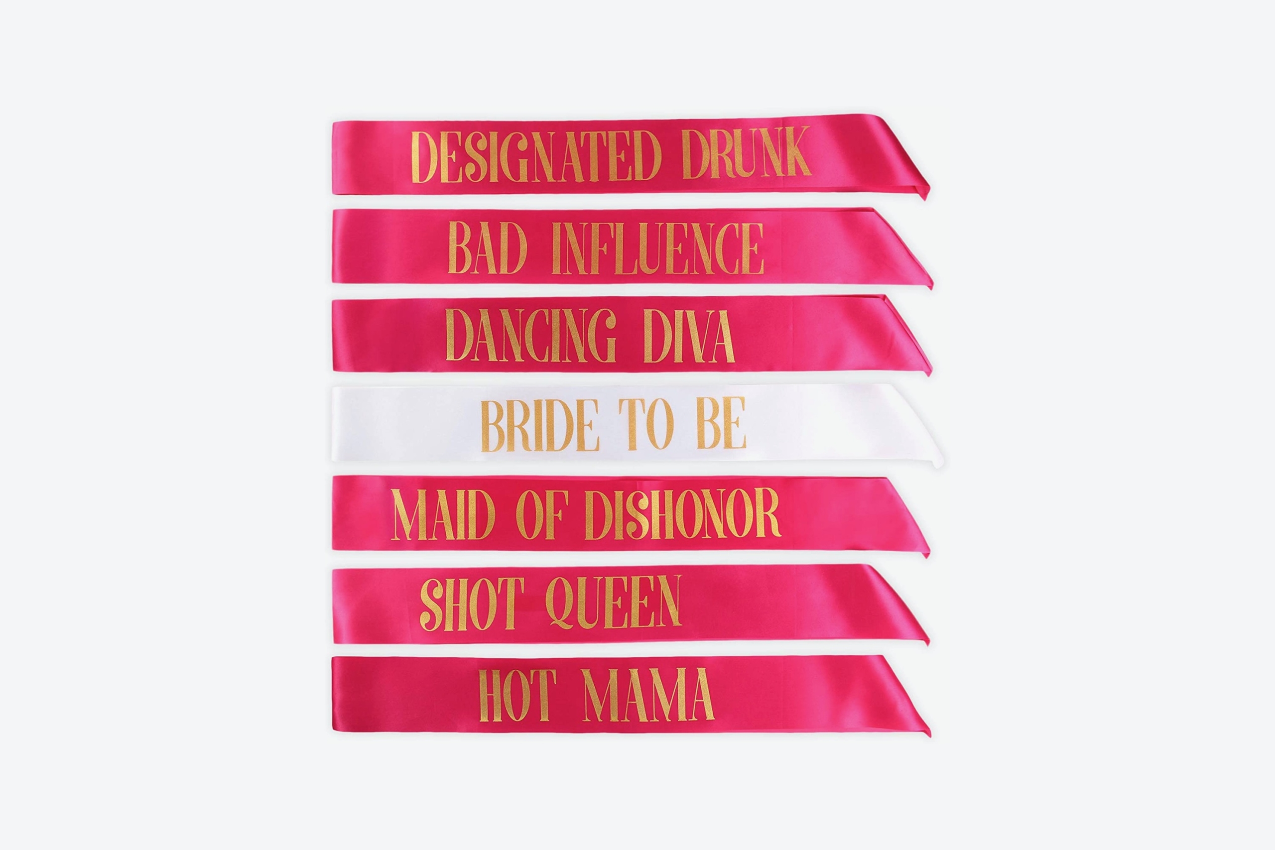 What’s a bachelorette party without sashes? Make sure that your No. 1 bride and her entourage have the most fun sashes that make this party the event of the year. With gorgeous gold lettering and fun messages, these high-quality sashes will be the perfect party favors for your gals to keep after the night is over.