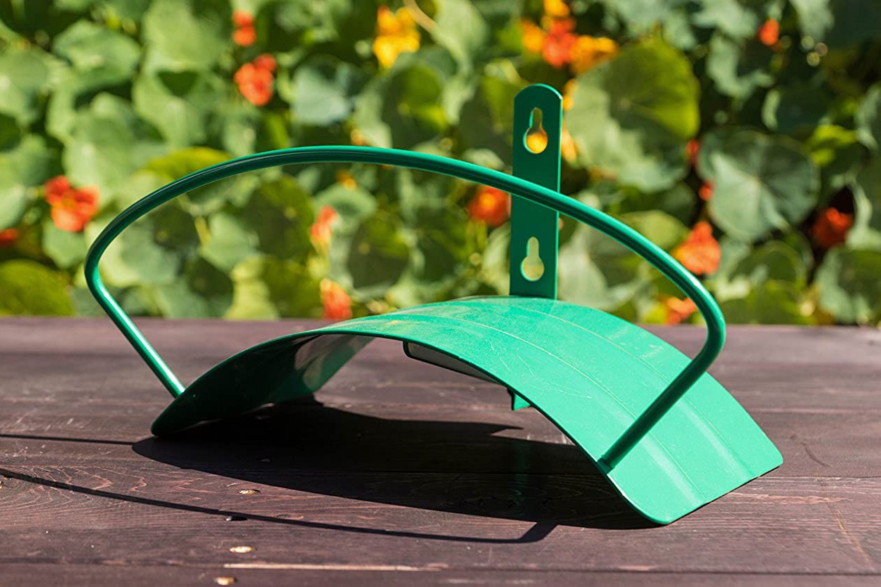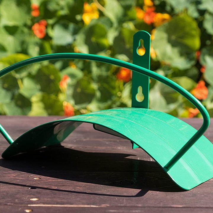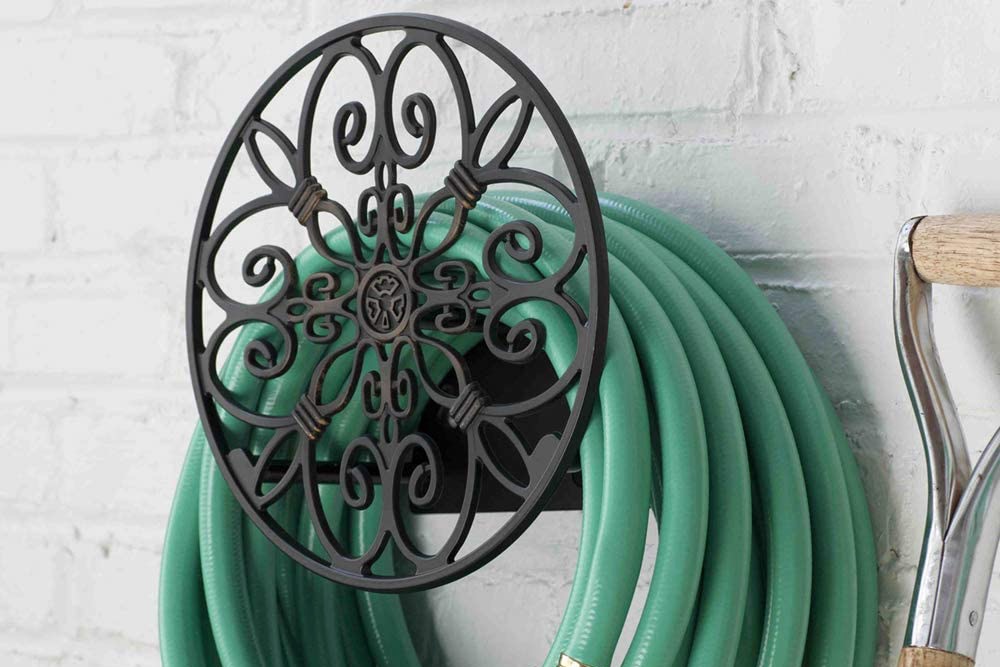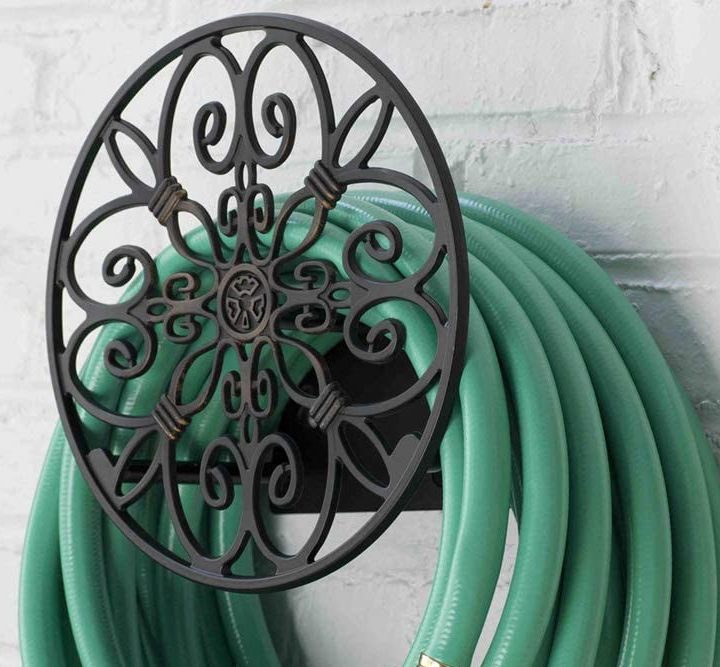 A wall-mounted hose hanger doesn’t need to be drab and dull. For added pizzazz, seek out an attractive one, like the Liberty Garden Decorative Wall-Mount Hose Hanger. It offers an attractive design that can complement most decor and an all-cast aluminum construction that can resist rust.
