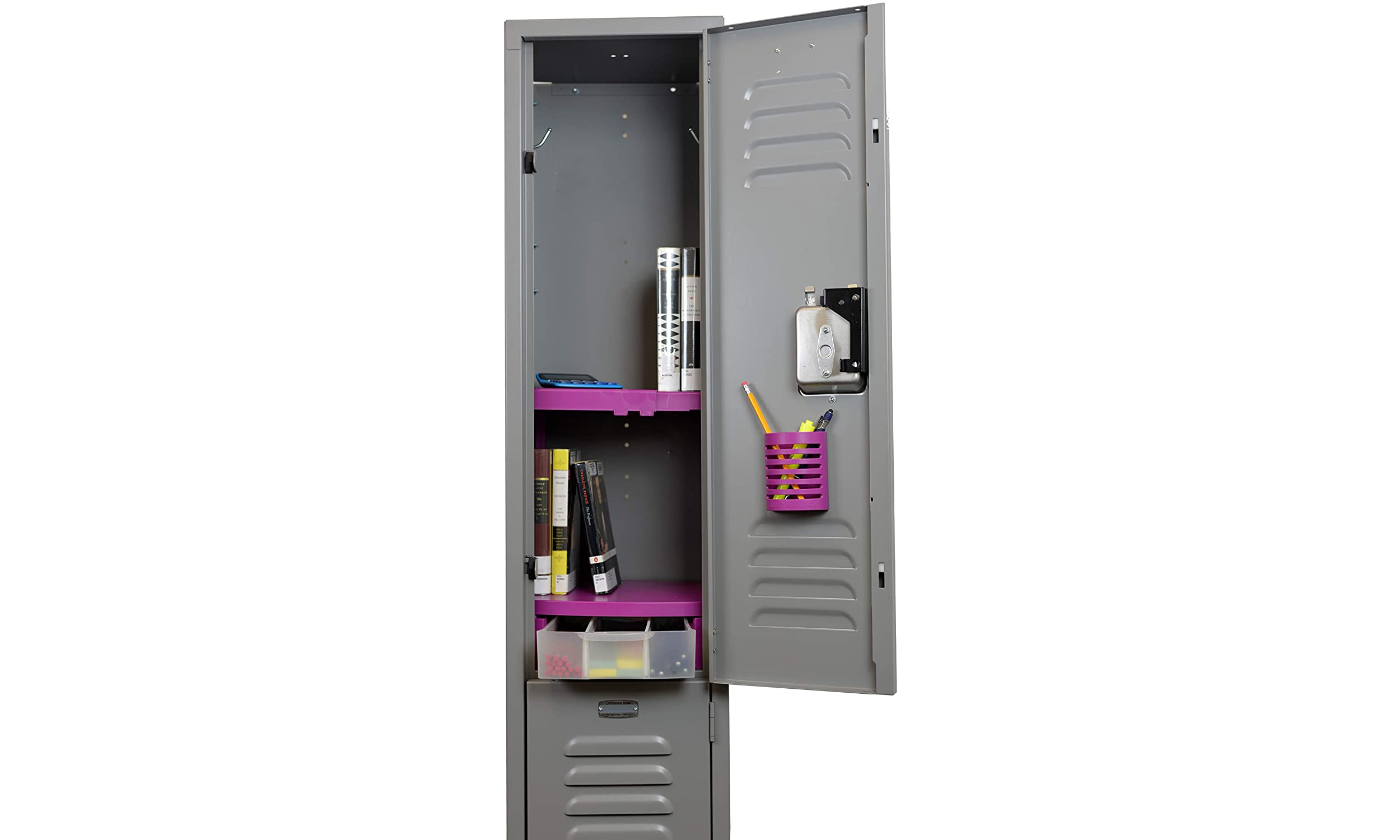 If you are looking for a more versatile solution, the Tools for School Locker Drawer and Shelf sets itself apart from the competition with the amazing design that features a handy 10-inch drawer at the bottom of the unit. With an adjustable height, sturdy plastic construction, and weight-holding capacity of 40 pounds, this shelf is the perfect lightweight solution for standard-size lockers.
