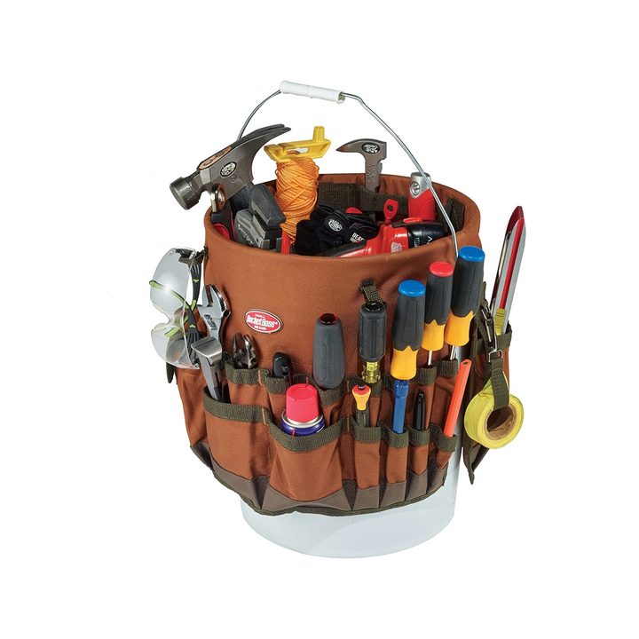 With three interior loops for hammers, drills, pry bars, and other long-handled tools, the Bucket Boss is a tool organizer that fits most 5-gallon buckets. It also features 30 pockets for tools of all shapes and sizes, while leaving the center of the bucket open for bulk storage.