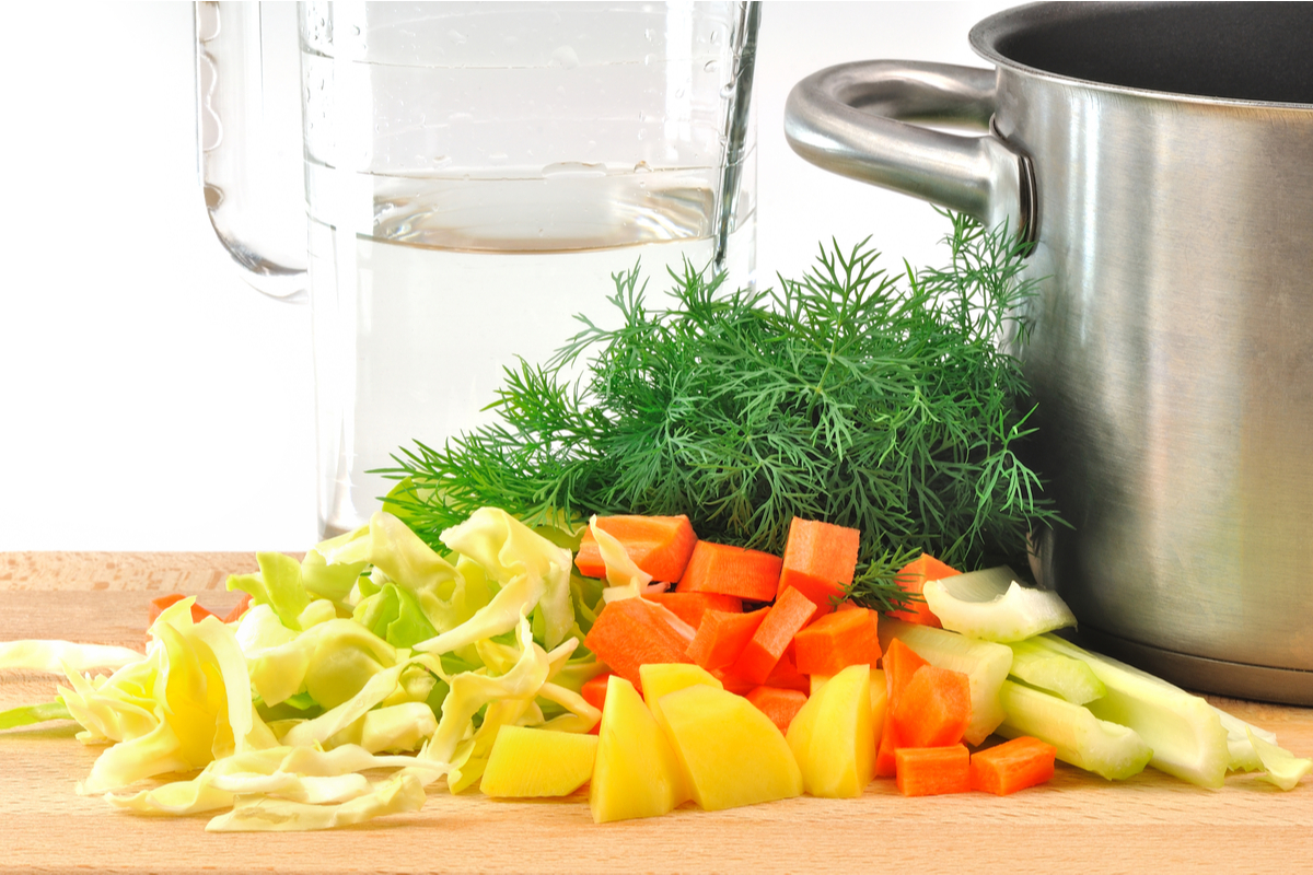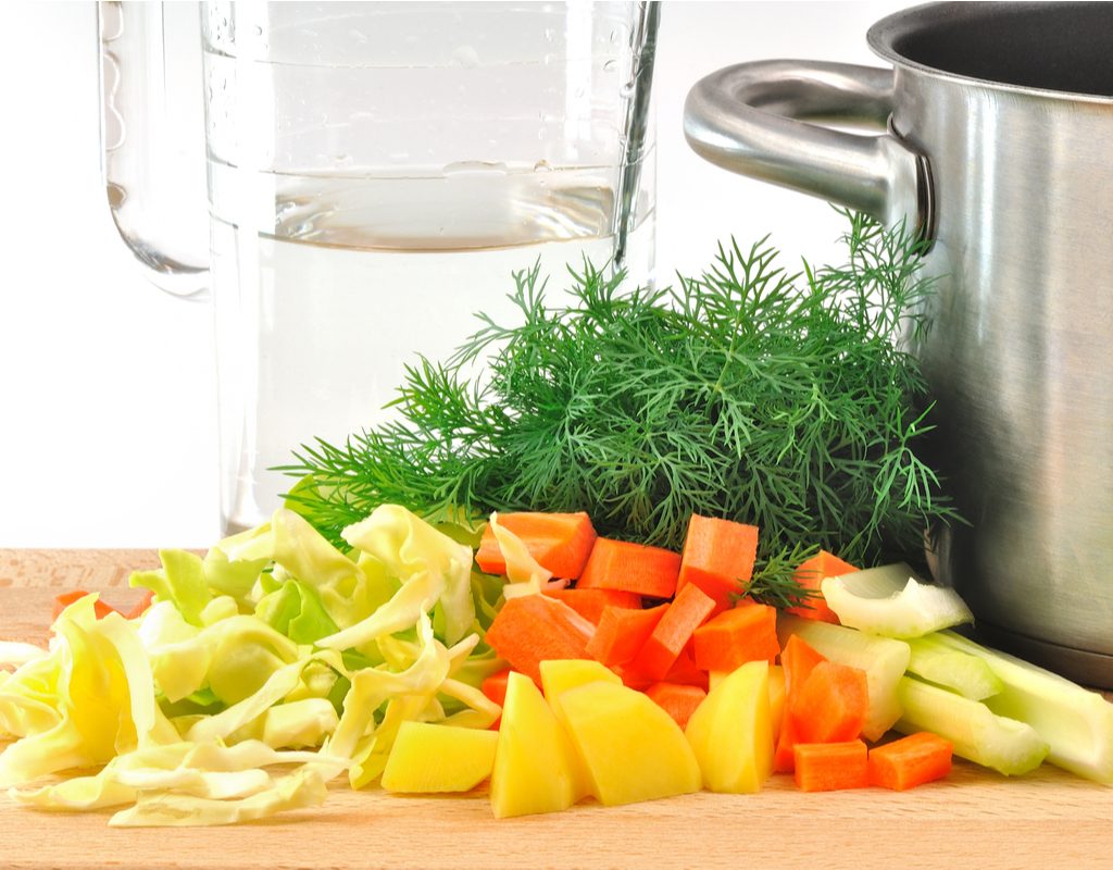 - Cook: Add a little butter or olive oil to the pot and sauté the chopped veggies over low heat until they soften and become fragrant. Add about 4 cups of stock or water (see below for an easy homemade vegetable stock recipe) and simmer.