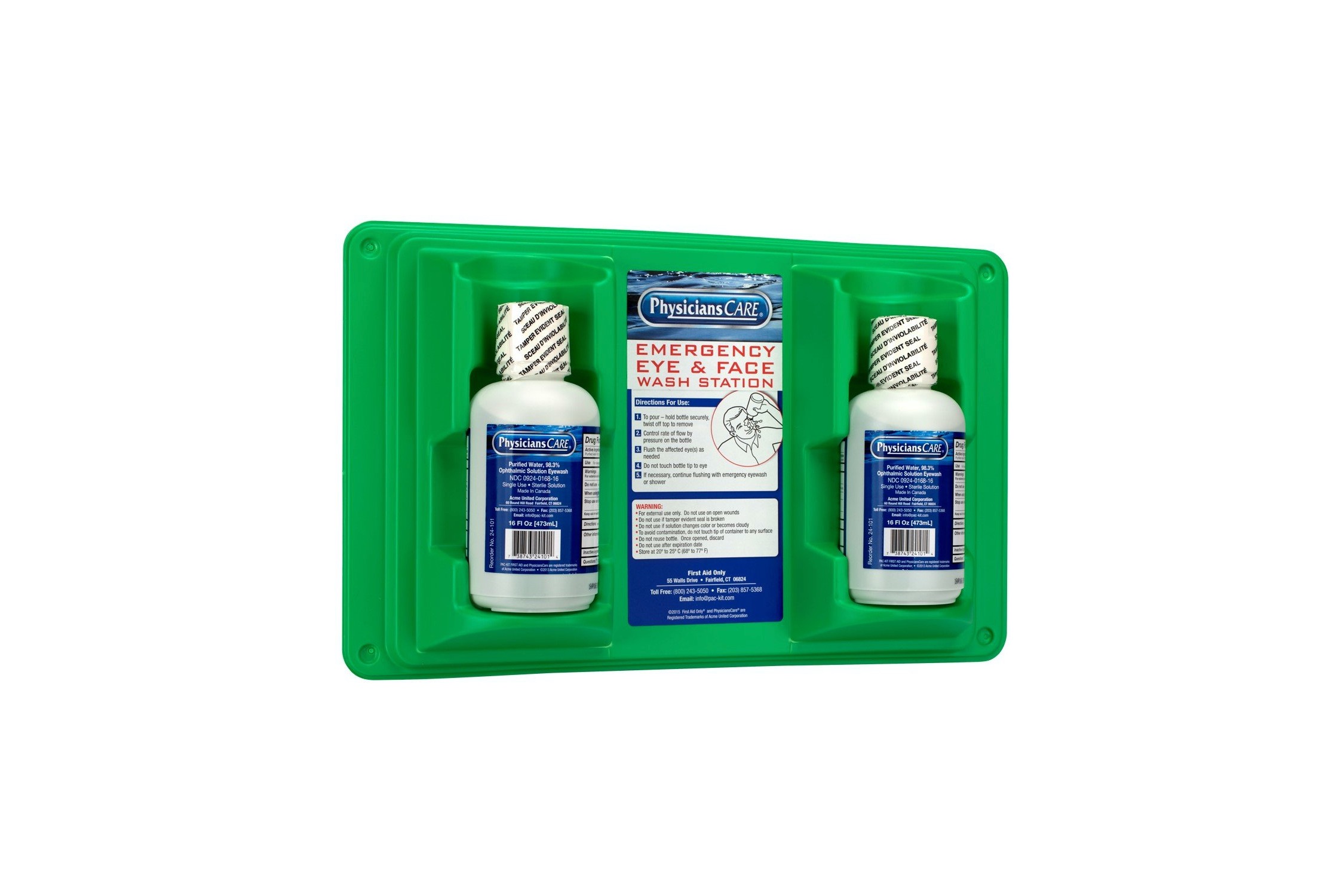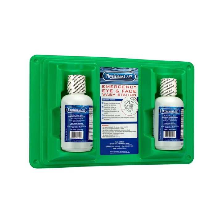 The PhysiciansCare Double Bottle Eyewash Station is perfect for those remote worksites or places that lack a safety infrastructure. This two-pack of bottled eyewash is super portable and can be made available in almost any situation. It helps clean the eye from any foreign material to relieve itching and burning. Meets OSHA regulations 29 CFR 1910.151.
