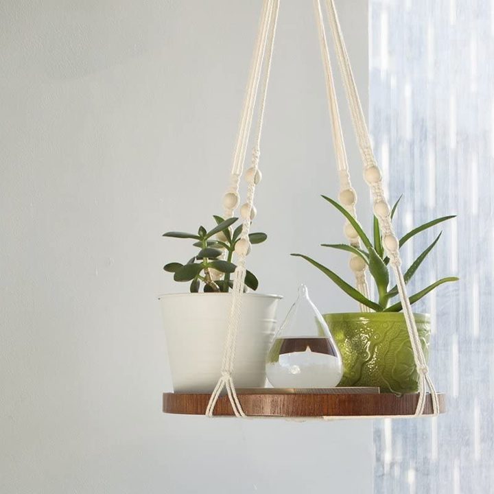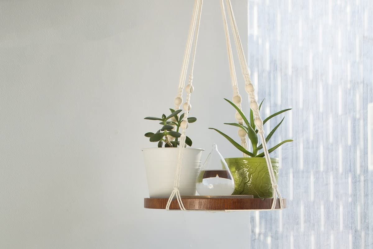 Casually hang your plants and other decorative items with the Timeyard Macrame Plant Hanger. This bohemian accessory features a twisted cotton cord, raw wooden beads and an oiled chestnut wooden base that hang beautifully from the ceiling to give your home a chic, natural touch in any corner.