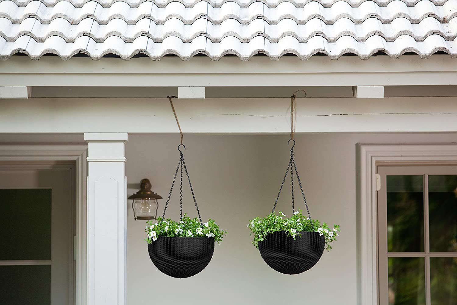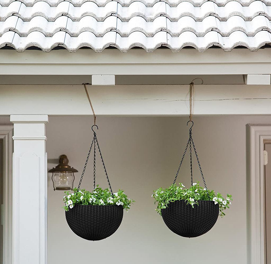 Keter crafted this set of two hanging planter baskets, which is your best overall choice. The polypropylene resin material flawlessly mimics rattan and prevents peeling, rusting, and other damages. These rounded baskets contain a drainage plug to prevent leaks, making it suitable for indoor as well as outdoor use. If you want a hanging planter set that will last, Keter’s hardy resin basket set is your best overall bet.