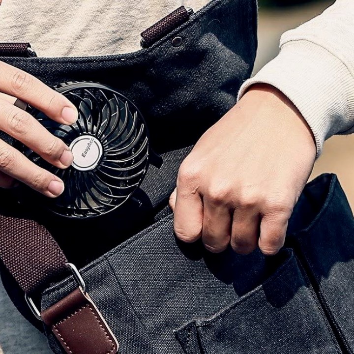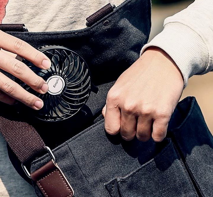 For total convenience and versatility, the EasyAcc Handheld USB Fan is our top recommendation. Featuring a pocket-size design, internal rechargeable battery with up to 15 hours of operation per charge, and a folding handle that doubles as a stand, this is one of the most versatile options out there.