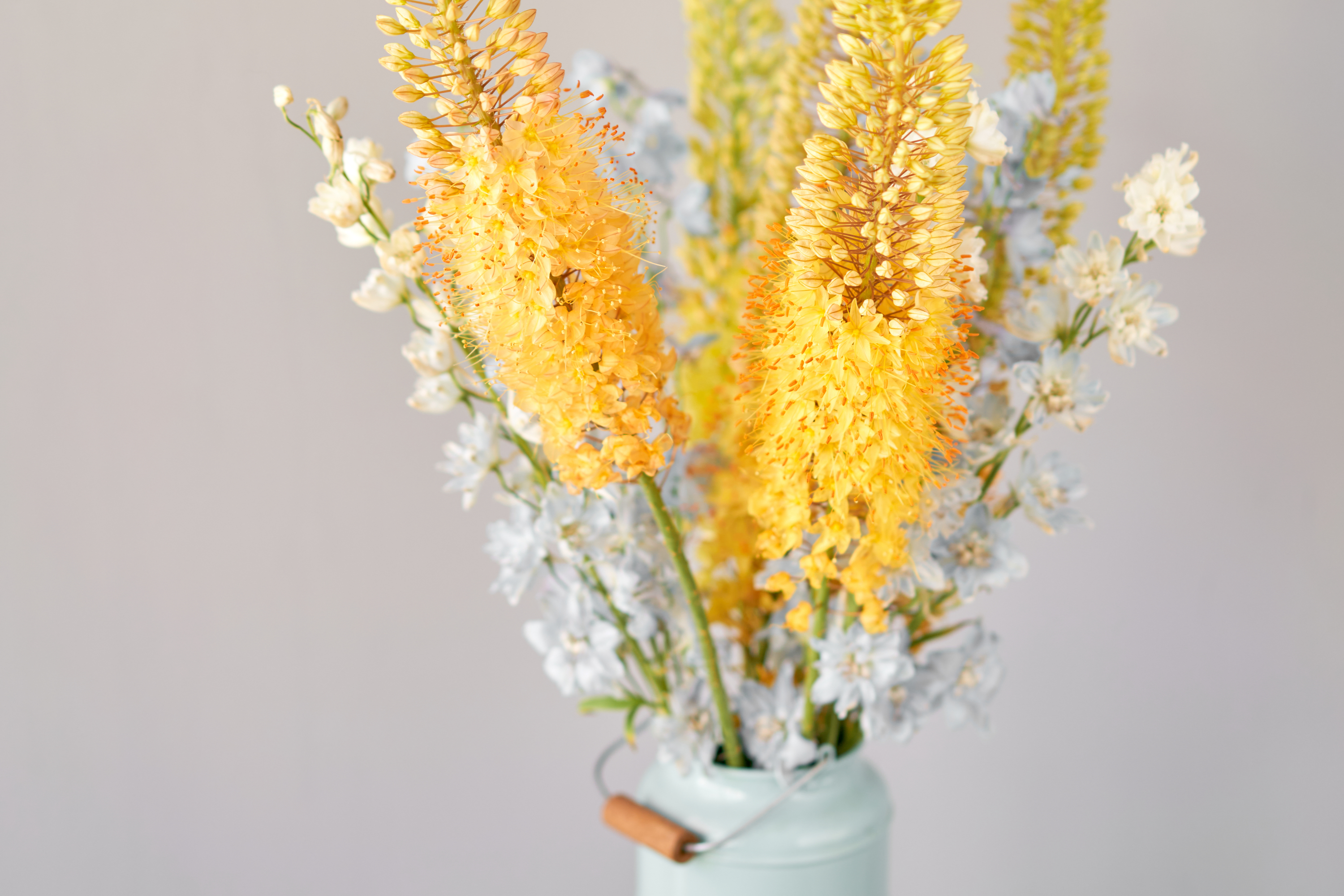 Eremurus, more commonly known as foxtail lilies, are woody tubers that yield a batch of densely packed flowers that can grow as tall as six feet. Most are a golden yellow hue, but you can find them in white, coral, and orange as well. The bottlebrush-shaped flowers open from the bottom of the spike to the top. Foxtail lilies are also toxic to pets and humans if consumed, so a high table or shelf is best if you have kids or animals in your home.