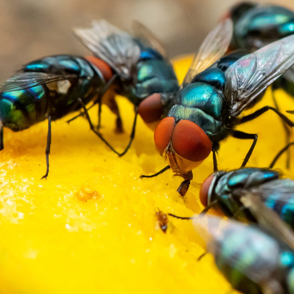Keep flies from congregating and breeding on your property by cleaning up all animal feces immediately and keeping trash cans tightly closed.