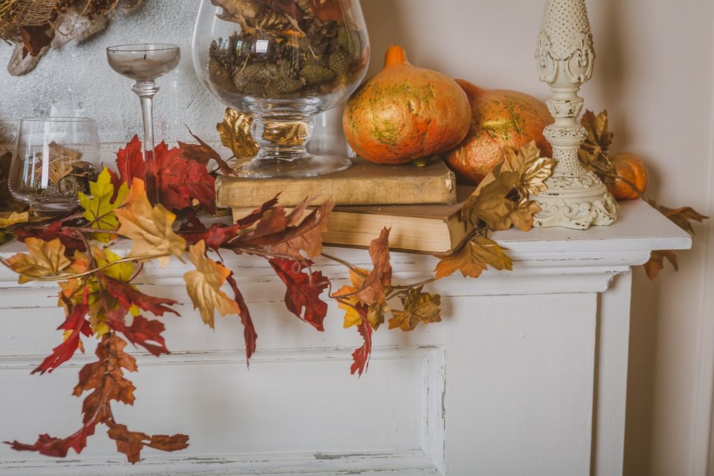 Just because you want to avoid pumpkins doesn’t mean you can’t still go traditional with your mantel decor. You can’t go wrong with classic fall colors like vibrant reds and oranges paired with golds and browns. Traditional leaves paired with sprigs of bright red berries and galvanized metal will create a standout mantel. Sunflowers, pinecones, and acorns are all great fillers for the areas around your candles and other pieces. Candles are super traditional and necessary for a fall mantel.