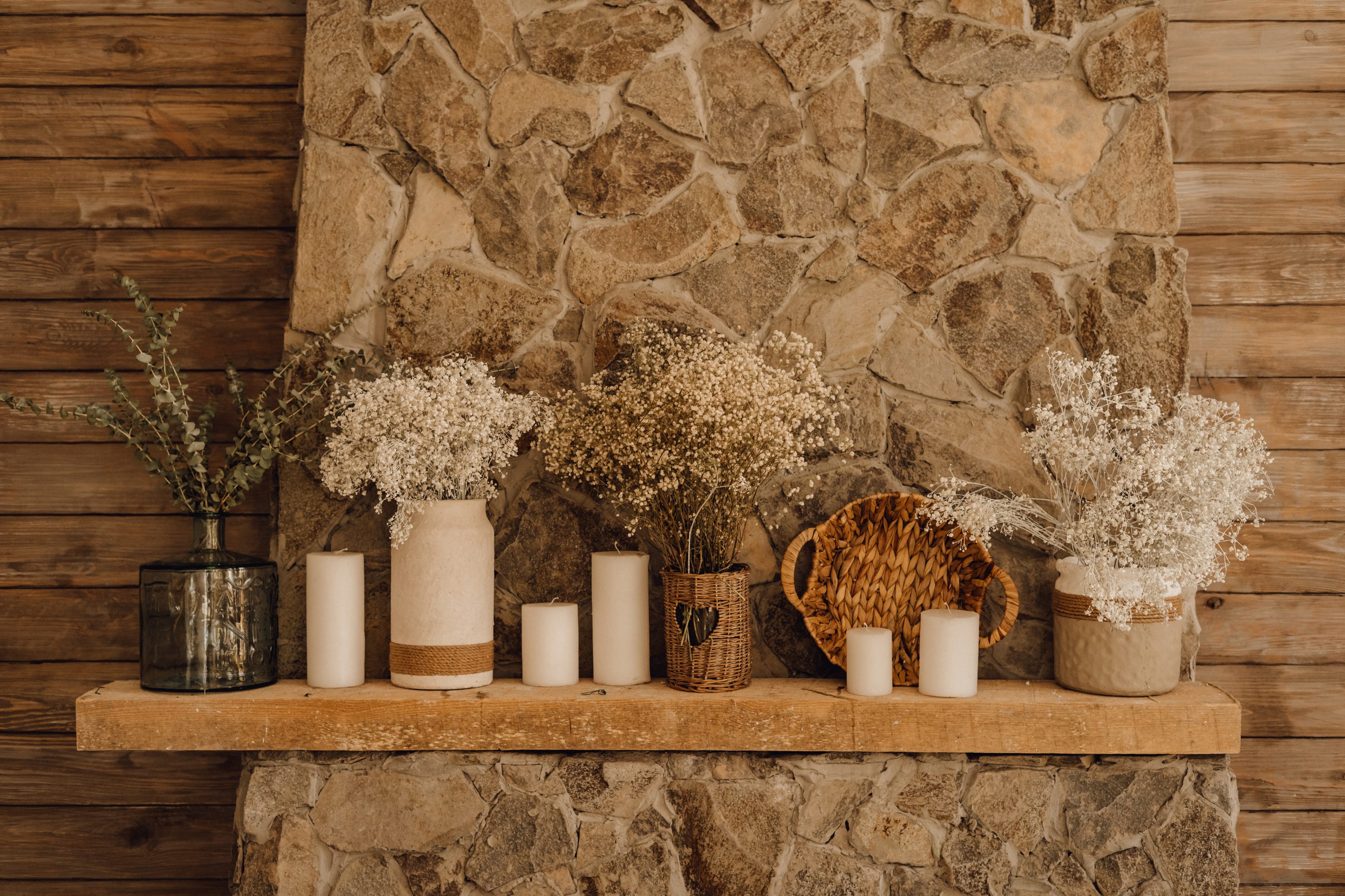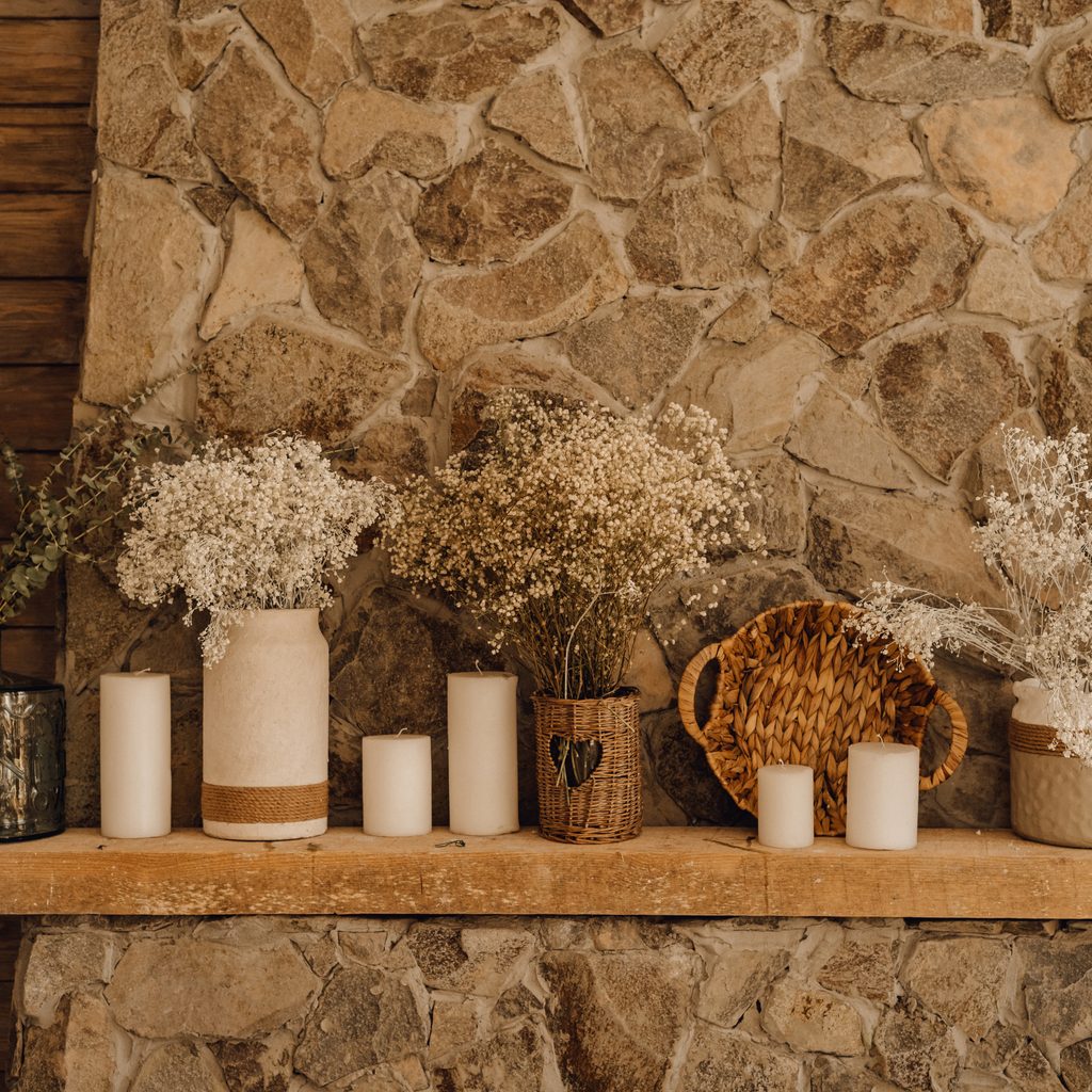 Lots of whites, off-whites, and candles will help round out the natural look. Wheat bushels in clean glass vases paired with natural wood will also help you pull off a natural look. A wreath with light blue and green leaves hung on a mirror above the mantel will also make a statement.