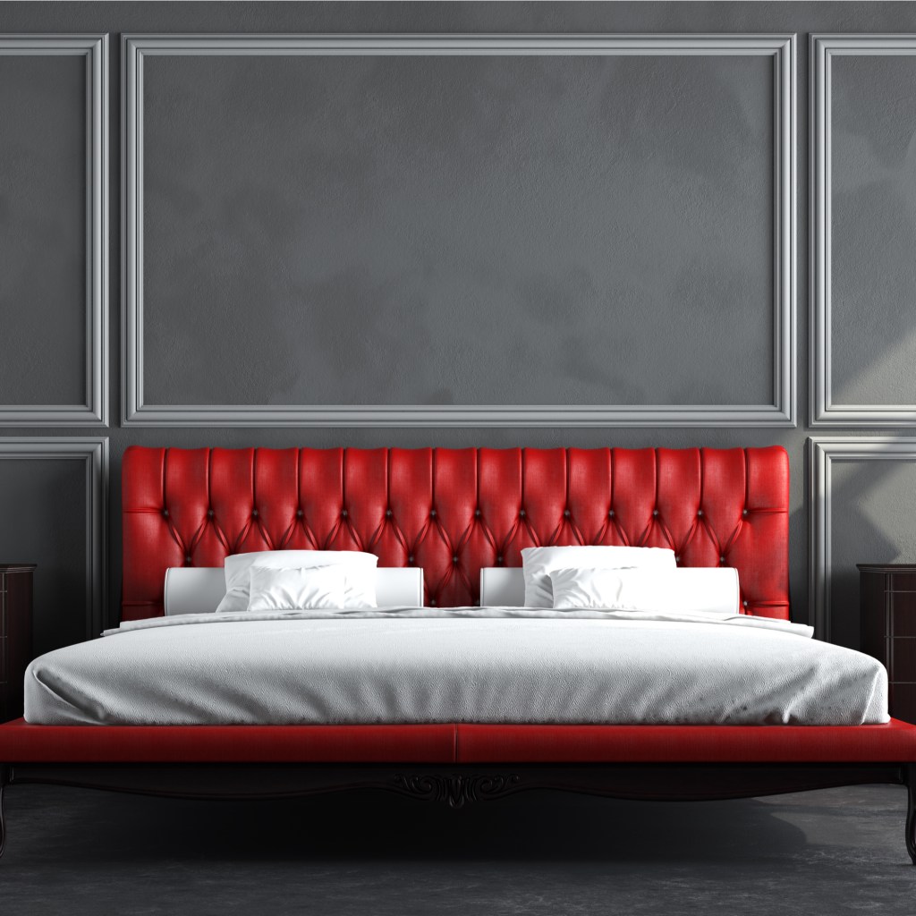 If you chose a red bed frame, contrast that with more muted bedding and pillows so the reds don’t compete for attention. That will create a more monochromatic look on the bed itself, leaving the headboard or frame to stand out.