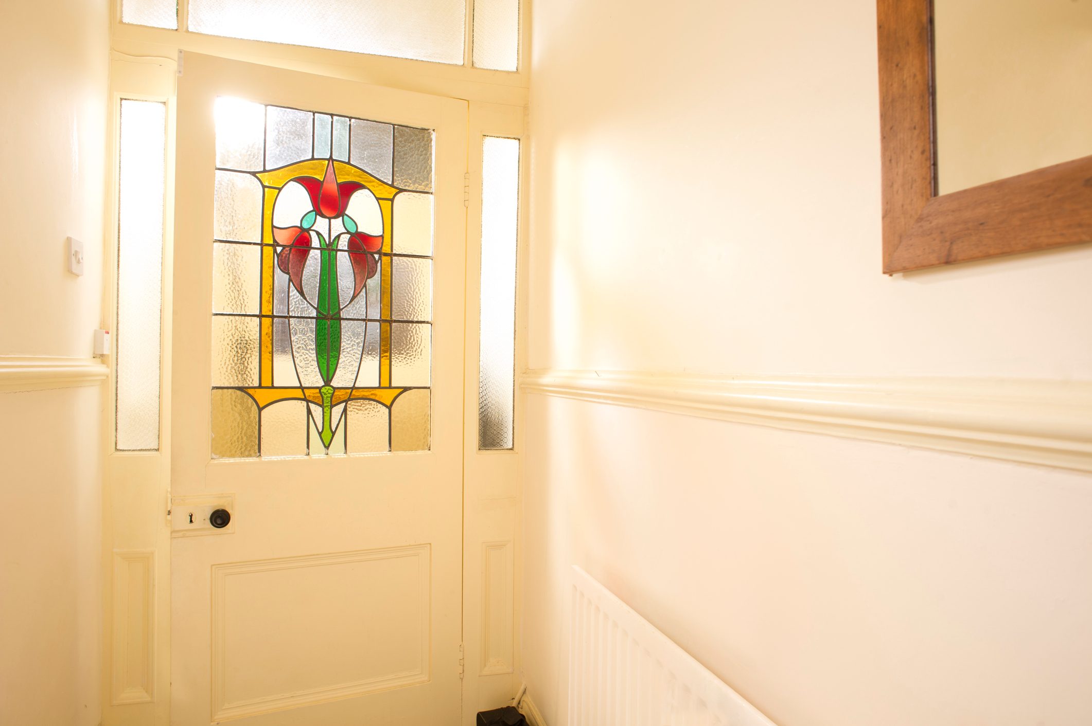 If you’re interested in trying out a piece of stained glass in your foyer, but you’re not quite ready for a door panel or window, check out a lamp for your entryway table, a standalone floor lamp with stained-glass lampshade, stained-glass hanging light fixture, or others.