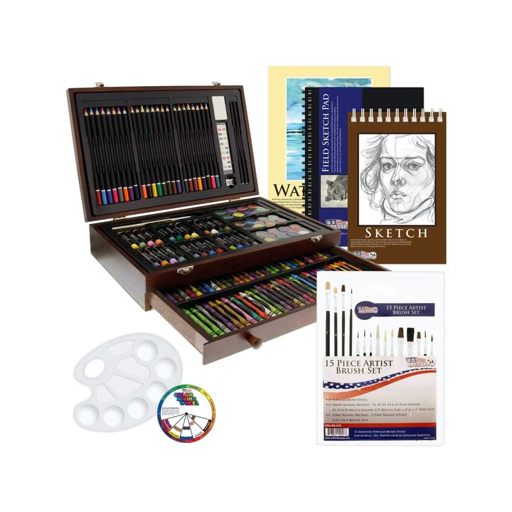 If you’re looking for a complete kit to get started in your artistic journey, the US Art Supply 162 Piece-Deluxe Mega Wood Box Art offers a wide array of mediums for you to experiment. It includes colored pencils, oil pastels, watercolors, wax crayons, papers, and a complete array of accessories. This portable kit is ideal for taking to the park, the museum, or any other place where inspiration may strike.