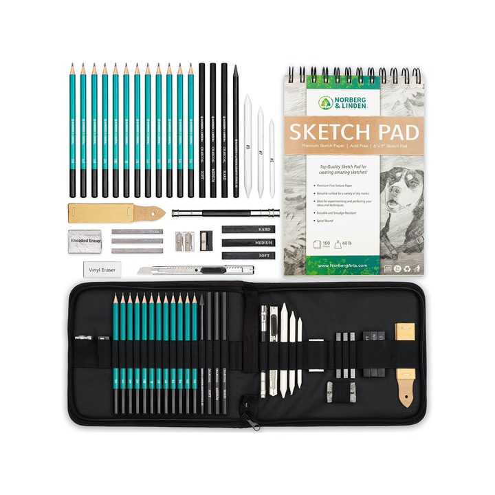 The Norberg & Linden XL Drawing Set is a professional-grade kit that is also appropriate for beginners to just pick up a pad and sketch away. Take this complete set anywhere with you and develop your technical skills at any level. Whether you’ve been sketching for years or have never done it before, this set is sure to help you grow as an artist.
