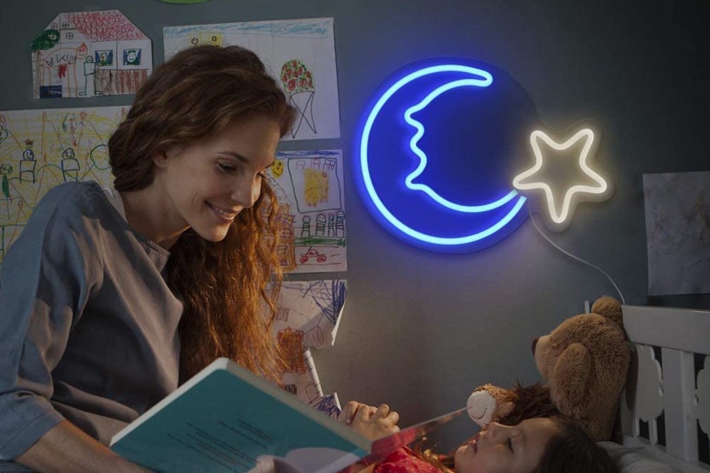Give your bedroom a soft warm glow with the OYE HOYE LED Moon Star Shaped Neon Sign. This charming neon lighting works great as a night light while also setting a fun ambiance with an easy-to-use USB connection. With its clear PC background, this LED light can be mounted easily and doesn’t lose its shape.
