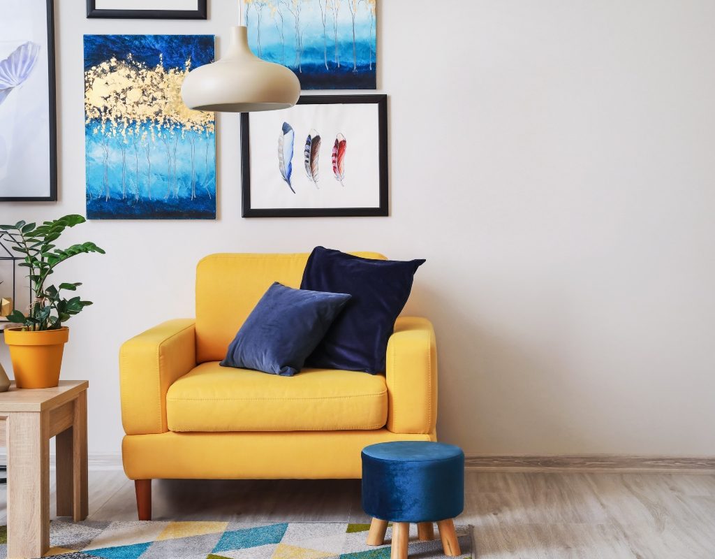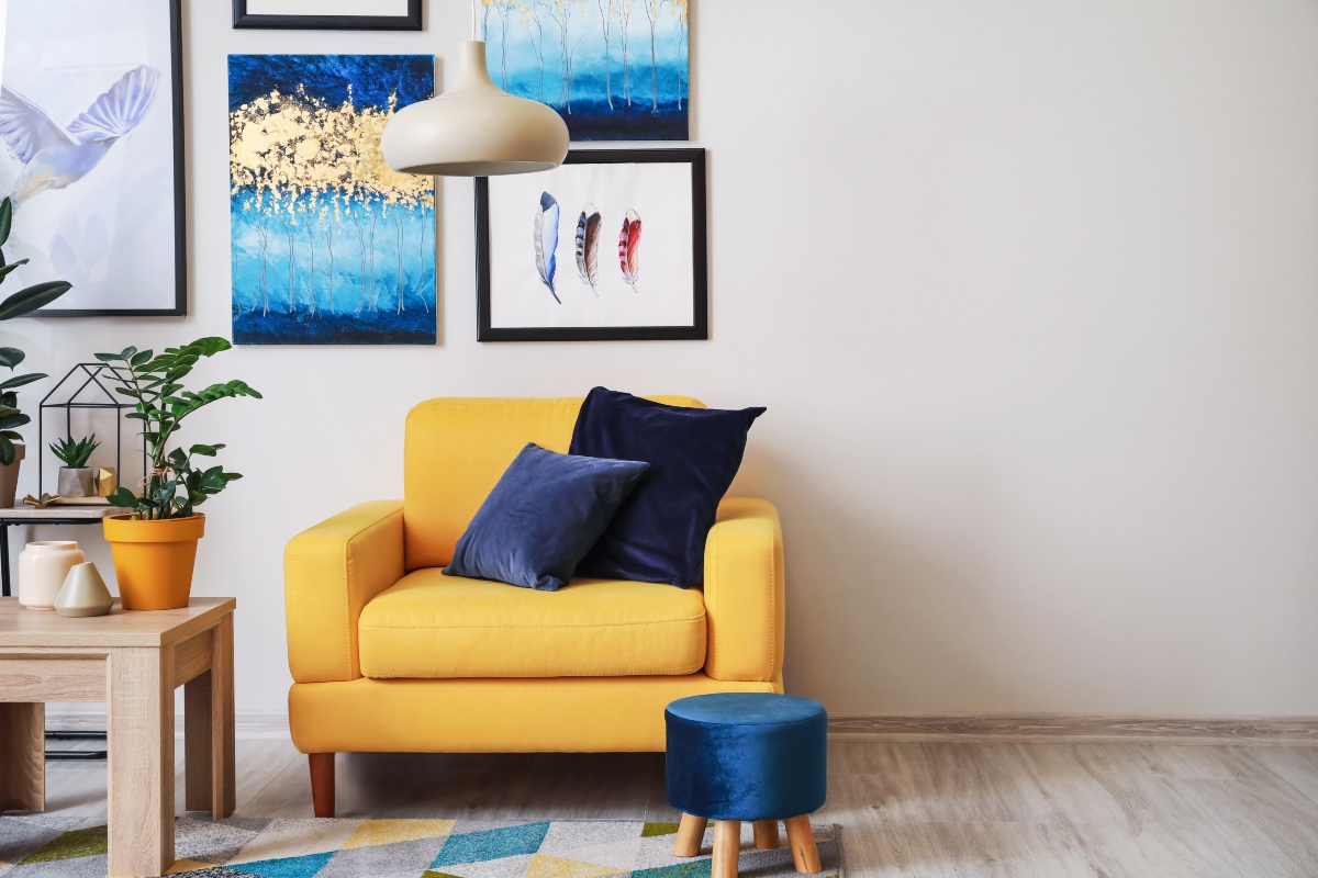 If you’re really looking for an exciting pop in your blue room, go with a bright yellow. It cannot be overstated how well yellow pairs with blue. This is especially true if you have a dark or medium shade of blue; yellow swoops in to elevate that blue color with a bit of contrast. Our suggestion: be bold with your bright yellow additions. Get a statement piece, such as a funky yellow lighting fixture, a large piece of wall art that prominently features yellow, or a yellow couch or chair.