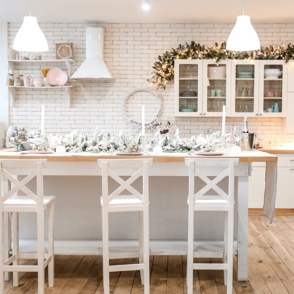 For some homes, red and gold can be a bit bold. Rather than using that palette, you can try a simple green, white, and silver combination. This muted alternative can feel luxurious while also more natural. Drape some evergreen garland atop your cabinets or kitchen island. Or use evergreen springs in a few vases to pull off an authentic and outdoorsy look. Use silver and white accents as needed to create a lovely, cohesive space.