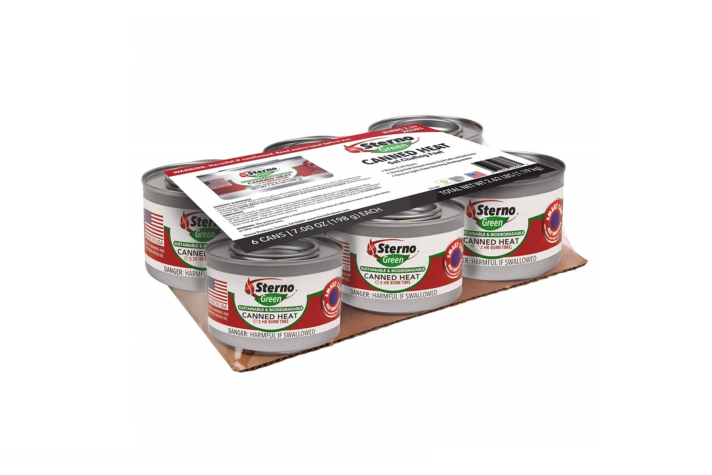 For top performance and sustainable materials, the Sterno Canned Heat Chafing Fuel pack contains six cans of gel fuel, each with over two-hour burn time. An ideal set for entertaining, catering, and camping. It provides a safe and environment-friendly food-warming solution and keeps food in the safe zone of 140⁰F. Plus, it’s a clean-burning fuel that does not emit carbon monoxide.