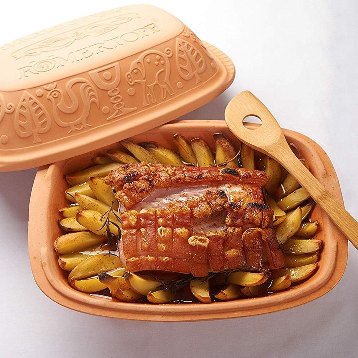 Cooking is more fun with a Romertopf clay baker. This beautiful, rustic roaster is made from high-quality German clay to create healthy, steamed dishes that retain the vitamins and minerals in your food. Use it to bake breads, pastas, stews, and much more. Its natural nonstick bottom allows for easy cleanup and contains no harmful chemicals.