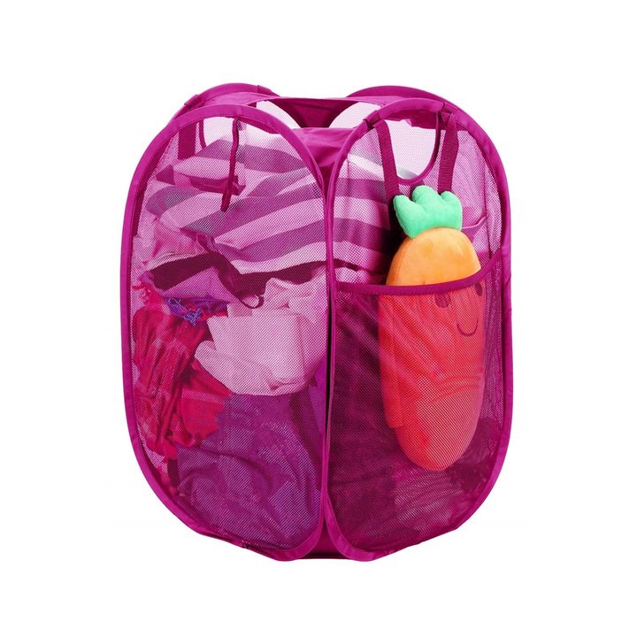 Carry up to 50 pounds of laundry with the sturdy House Again Mesh Pop-up Laundry Hamper. Made with polyester mesh that is 1.5 times stronger, a high-carbon steel frame and double stitched handles, this mesh laundry basket limits unpleasant odors while allowing your clothes to breathe. It closes up easily when not in use and can be stored flat.