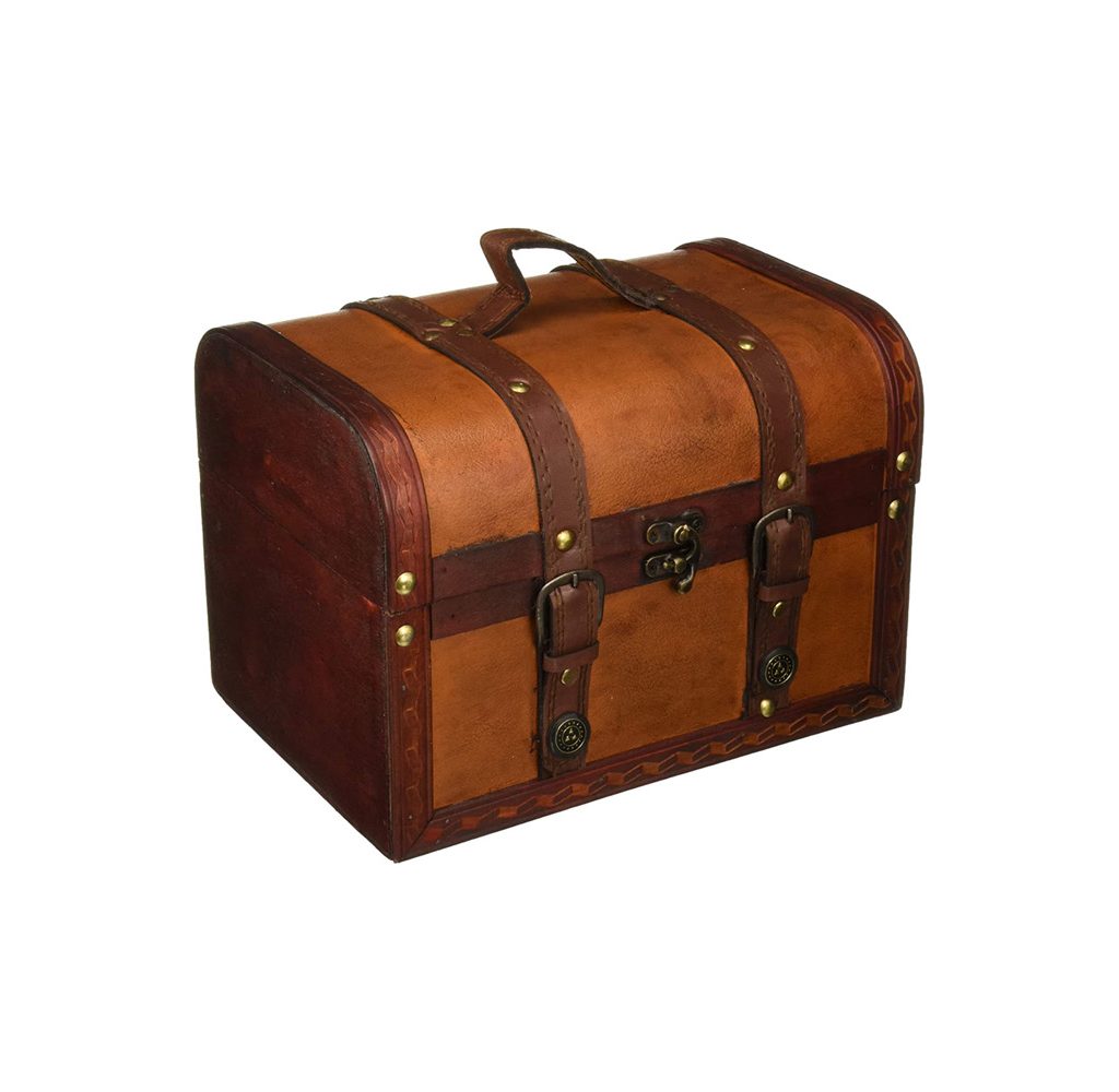Trademark Innovation’s decorative box mimics a vintage suitcase complete with metal clasp, leather straps, and wooden panels. It also has a carry handle for easy transportation, though it would do well permanently housed on your home desk for desk supplies, change, or trinkets.