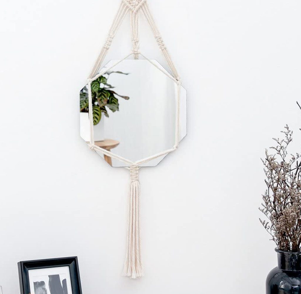 Bohemian and modern, the Mkono Macrame Hanging Wall Mirror features an octagonal mirror with polished edges and cotton rope. It measures 34 inches in height and 2.4 inches in width. It is artistic and contemporary, perfect for any bedroom or bathroom.