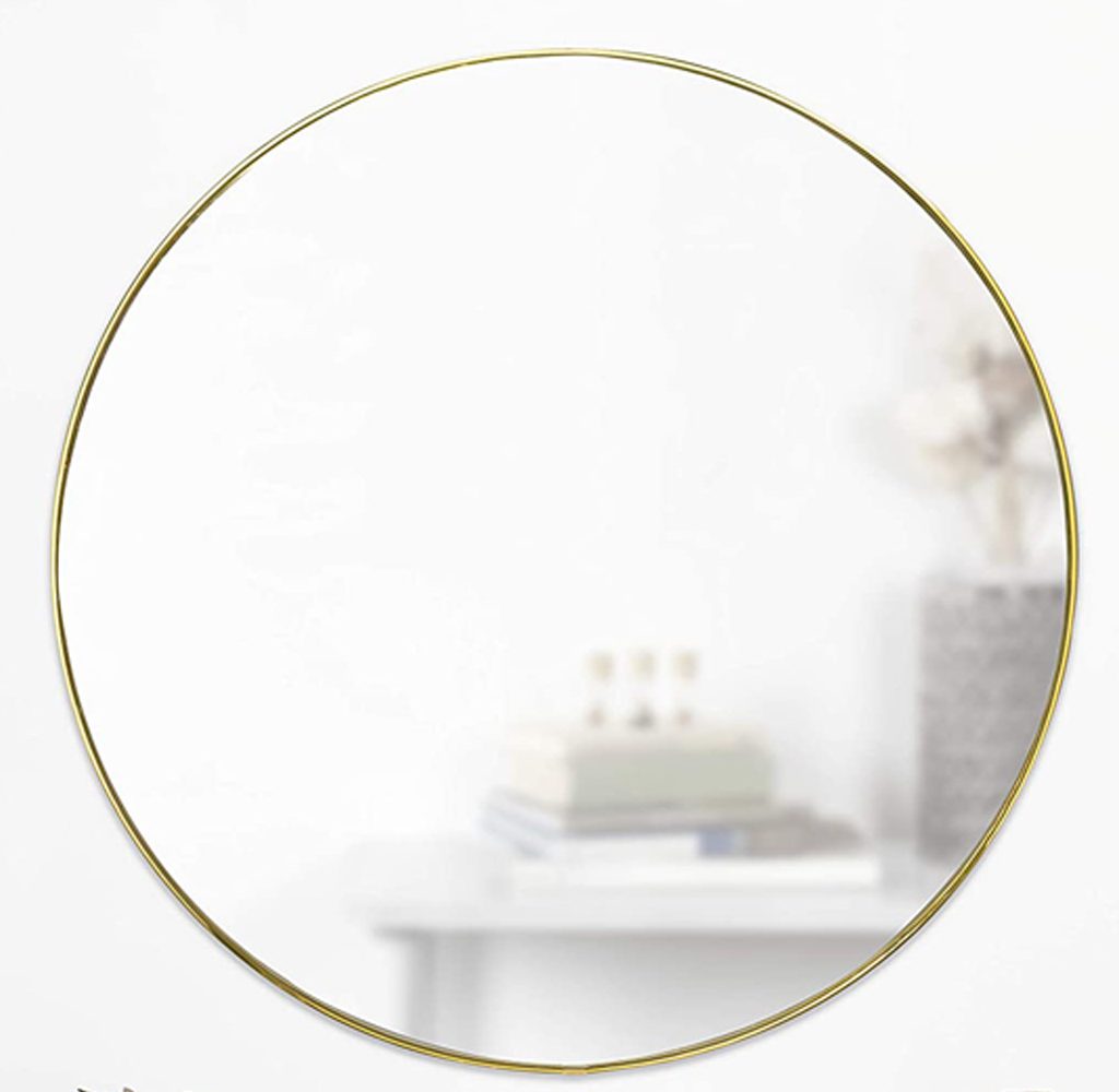 The Umbra Round Mirror features a 34-inch diameter with a classy golden rim that will bring a distinctive and classy touch to any wall. The large size is ideal to light up a room and also to provide full-face reflection. Ideal for heavy-traffic areas like hallways, living rooms, or bathrooms to open them up and prevent them from feeling stuffy.