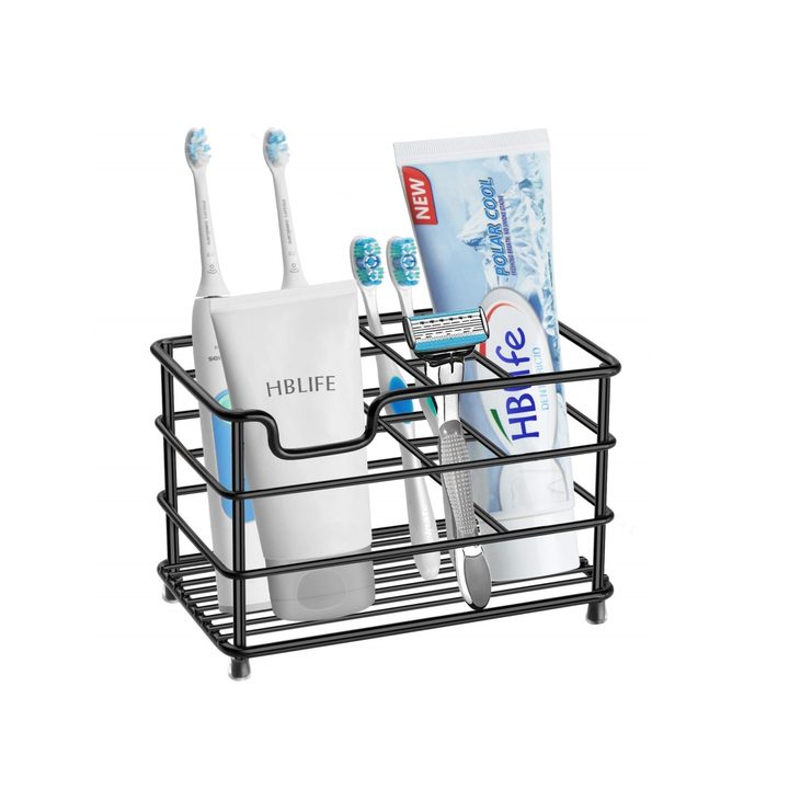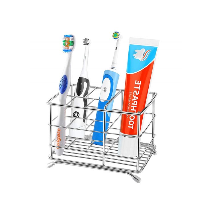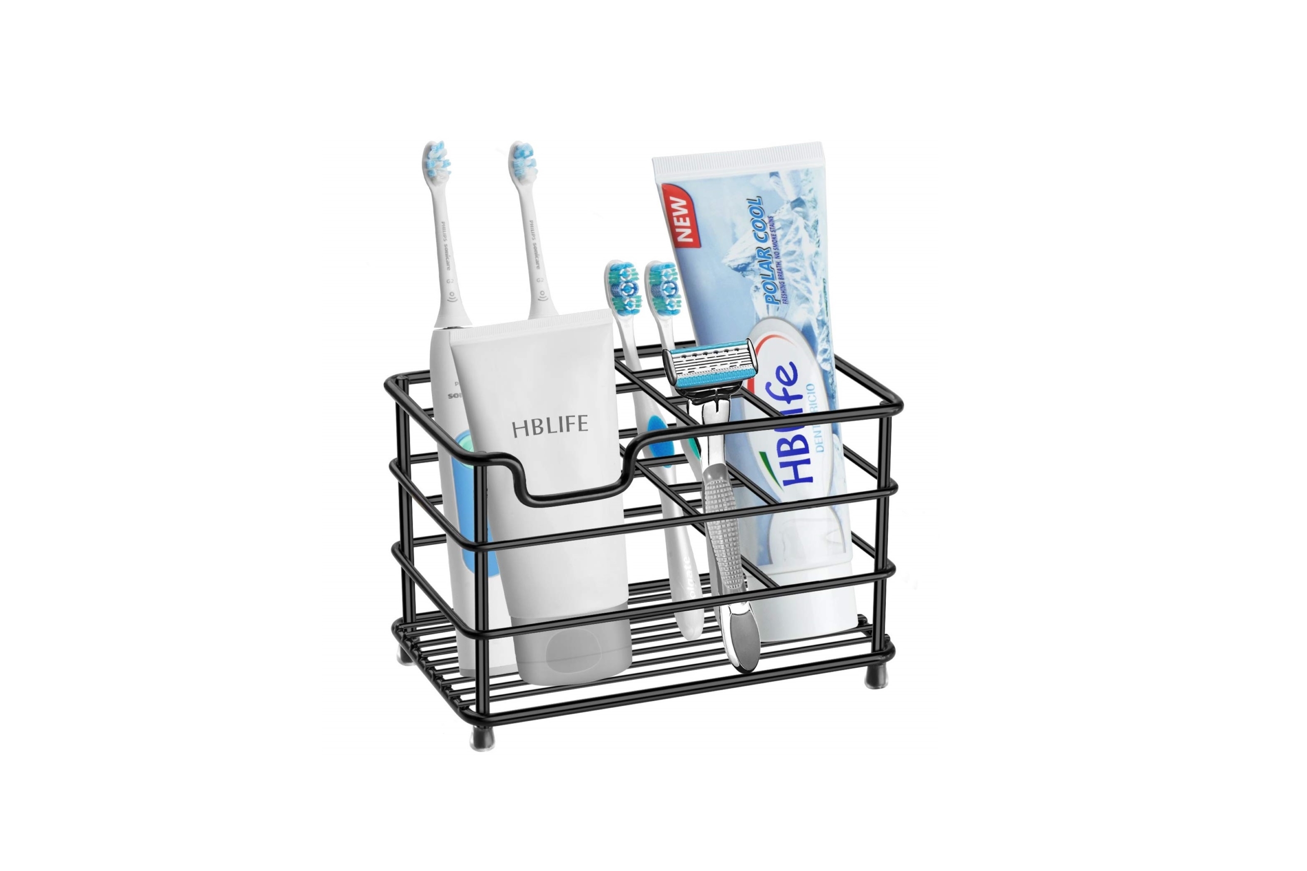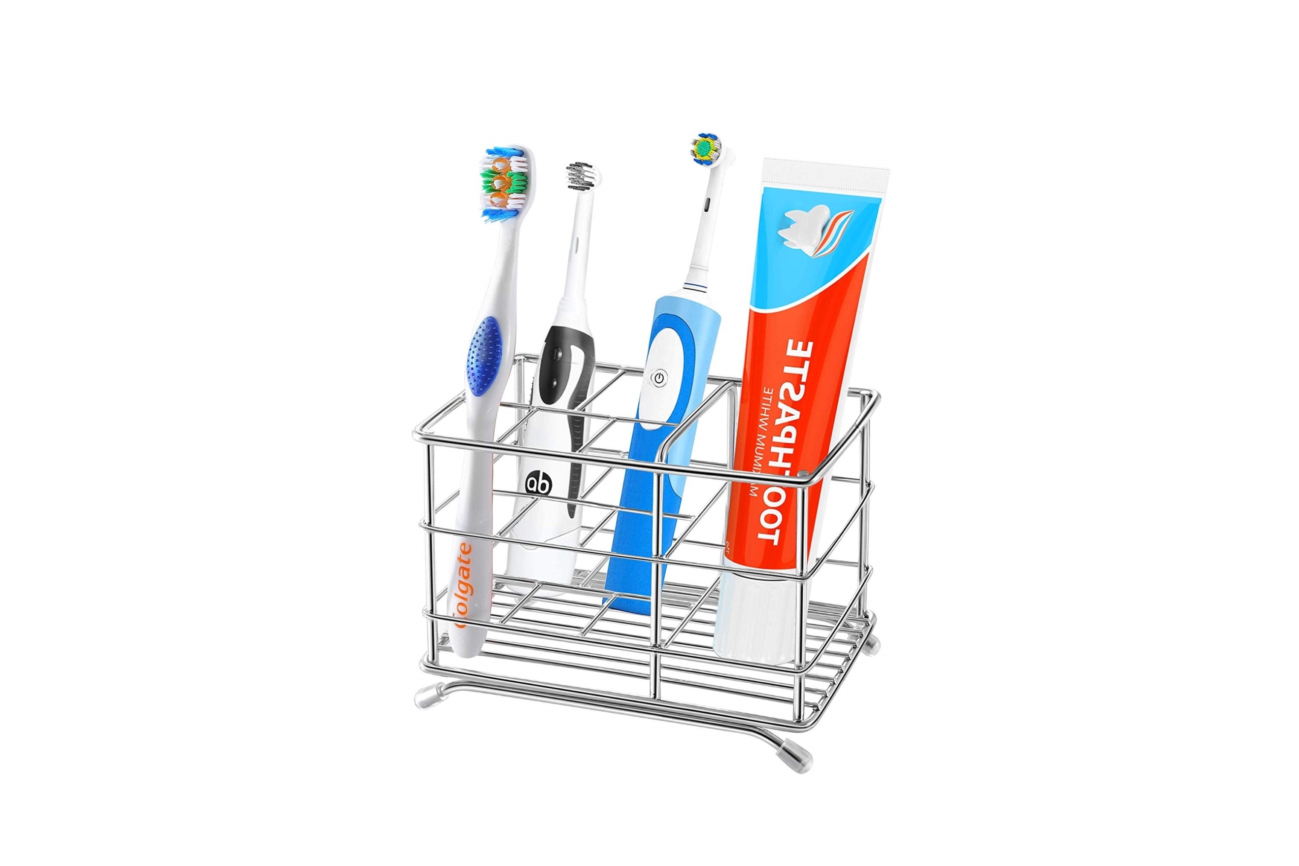 In terms of a good overall choice, the HBlife electric-toothbrush holder just might top the list. The large stainless-steel holder can store an electric toothbrush, regular toothbrushes, and toothpaste, as well as such bathroom accessories as a shaver, facial cleanser, comb, or eyebrow trimmer.