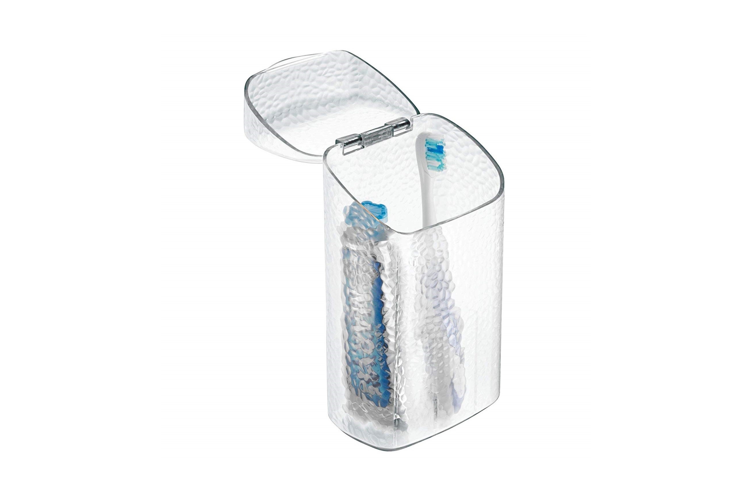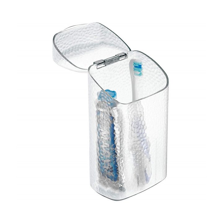 To prevent dust or dirt from falling on an electric toothbrush or bathroom items, a covered holder is the way to go. The iDesign Rain Electric Toothbrush Holder features a clear, transparent lid that can help keep toothbrushes clean.