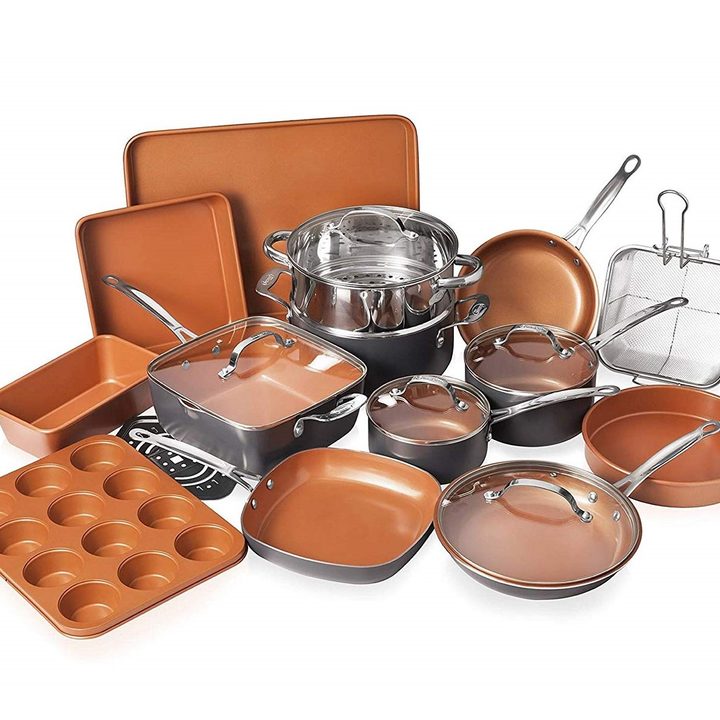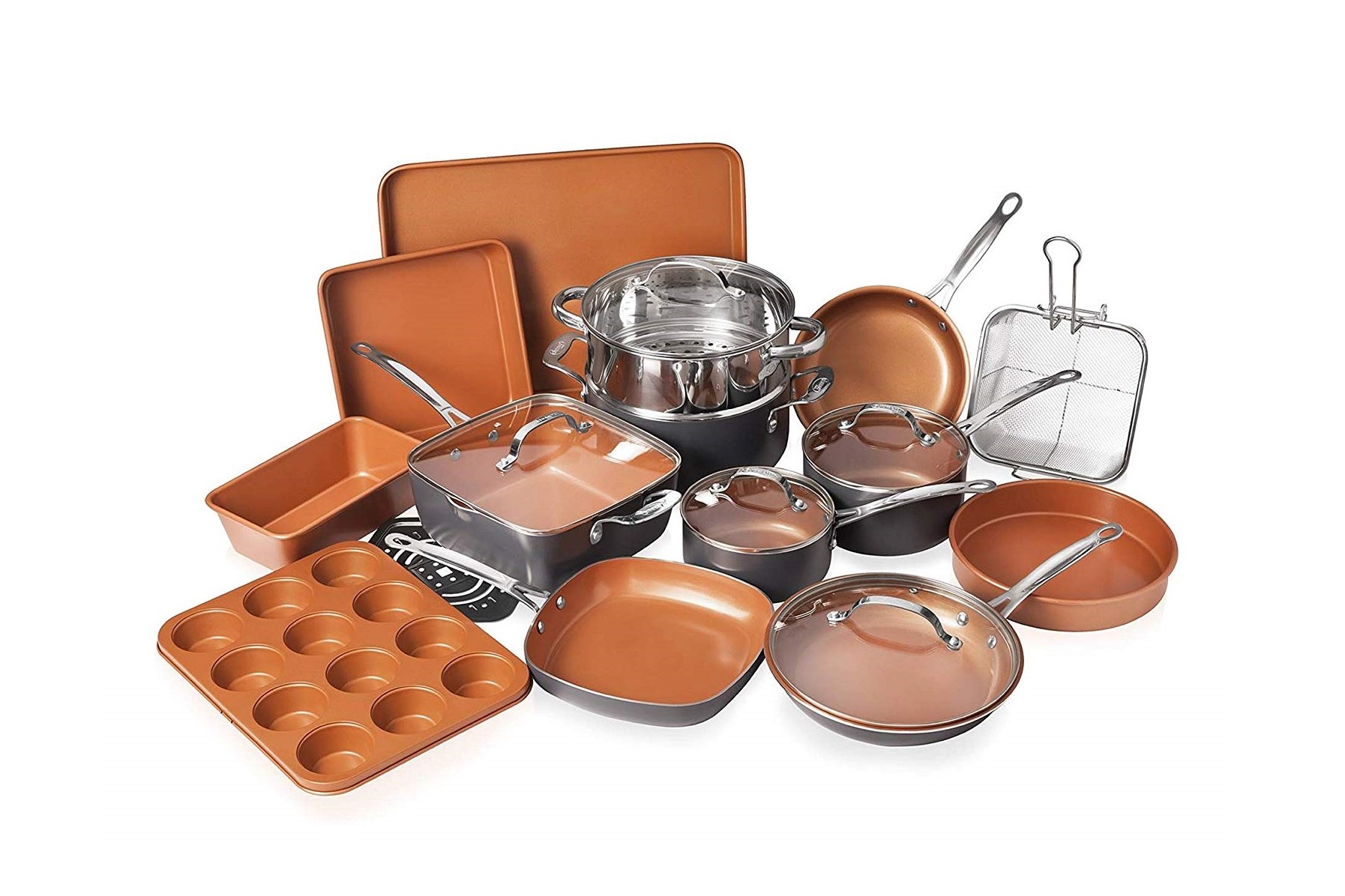 When it comes down to convenience, an all-in-one set of kitchenware gives you the most bang for your buck. If you want to take a full dive into quality cookware, the Gotham Steel Cookware and Bakeware Set is a 20-piece collection that includes every item you need to have a fully functional kitchen. Skillets, stockpots, deep-fry baskets — you name it, you have it in this wonderful collection of ultra-durable utensils. A solid investment for years of cooking to come.