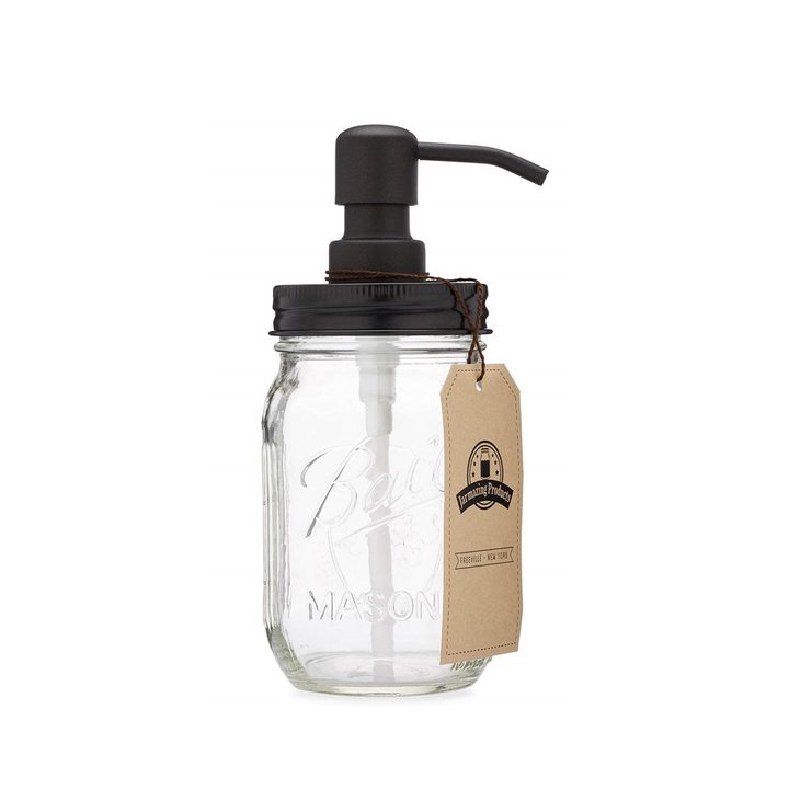 A strong overall hand soap dispenser option is one that’s highly functional and highly attractive. That’s the Jarmazing Products Mason Jar Soap Dispenser. The 16-ounce dispenser features black stainless steel components that resist rust and corrosion, and features the old-time mason jar design that fits many decors from farmhouse to industrial.