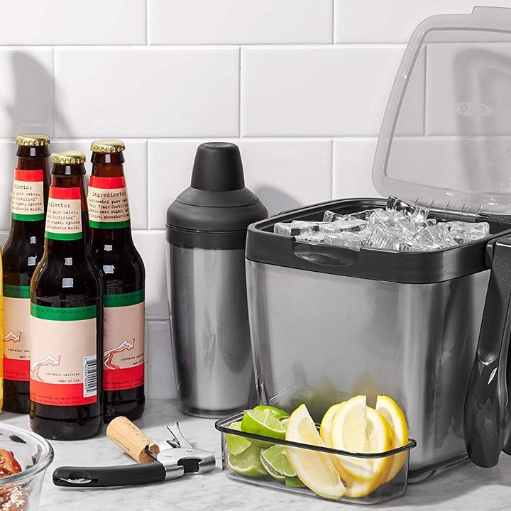 Take the party outdoors with the OXO Good Grips Ice Bucket. Featuring double-wall insulation and a meltwater reservoir, this is the perfect solution for barbecues, tailgates, or picnics. Its convenient carrying handle and nylon tongs give this bucket the portability you need to keep your ice frozen anywhere you go.