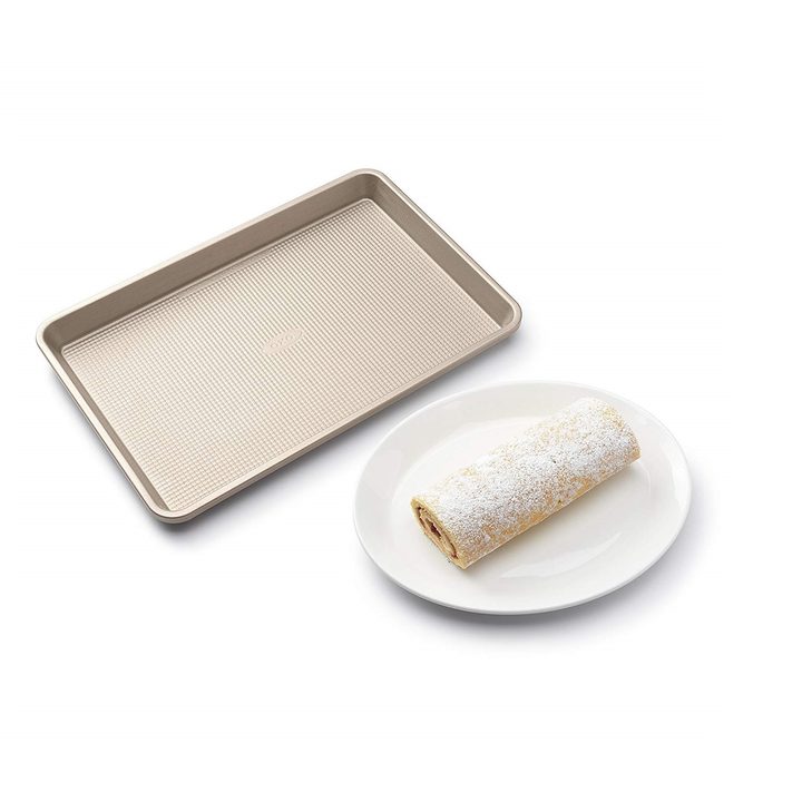 The OXO Good Grips Non-Stick Pro Jelly Roll Pan is the gold standard when it comes to quality and durability. Heavy-gauge aluminized steel creates superior heat distribution and makes sure there are no hot spots that can ruin your baked goods. A micro-texture enhances the non-stick effect for an easy release of food after cooking.