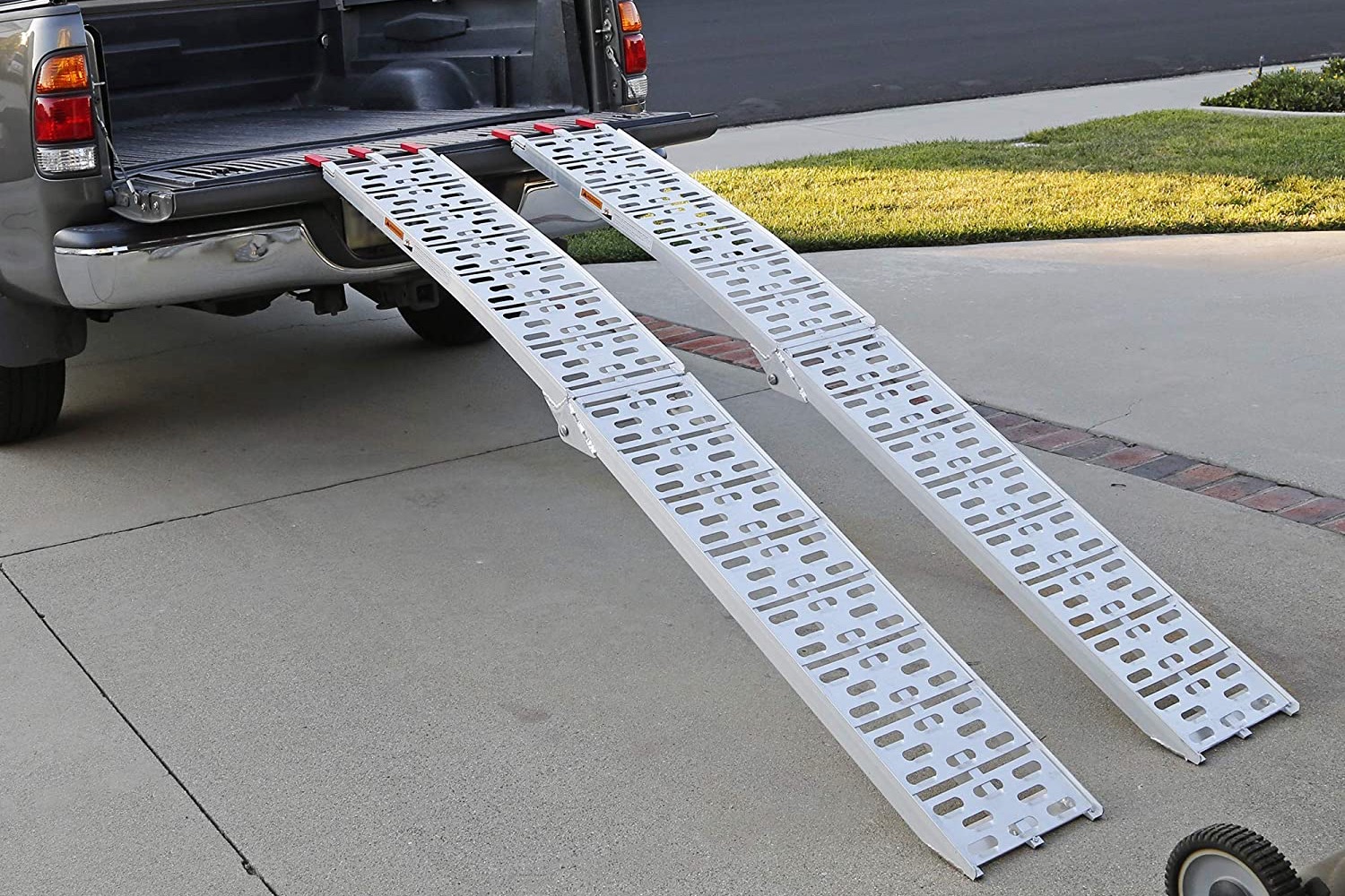 Transporting your bike safely doesn’t have to cost you an arm and a leg, that’s why we recommend the super budget-friendly Pit Posse Folding Motorcycle Ramp. This single foldable loading ramp is super durable, compact, and ready to store. Made of weather- and rust-resistant aluminum, it will hold up to 750 pounds of weight.