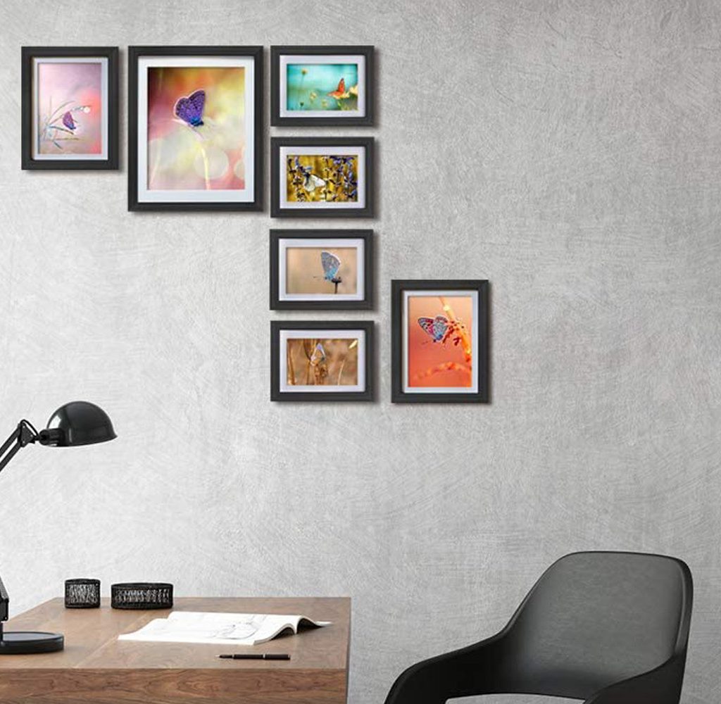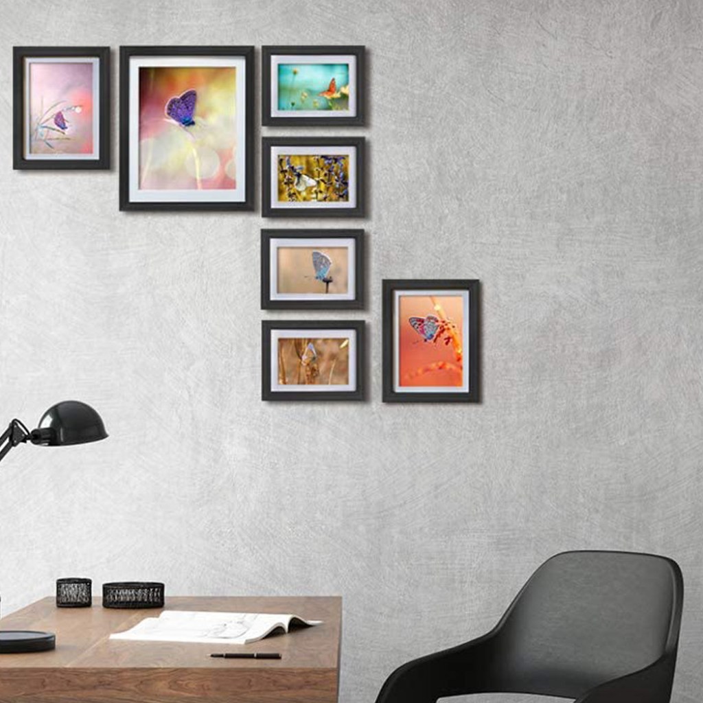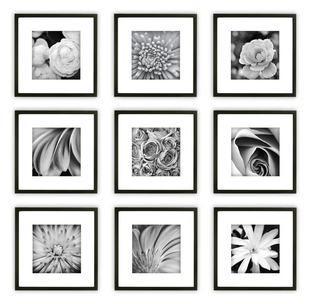 The Gallery Perfect Wall Kit allows you to easily frame nine squared photos in beautiful black wood and classic white mats, to dress any wall with elegance and modern style. You can hang them in a grid-like arrangement or any way you choose, with secure hardware included in each frame.