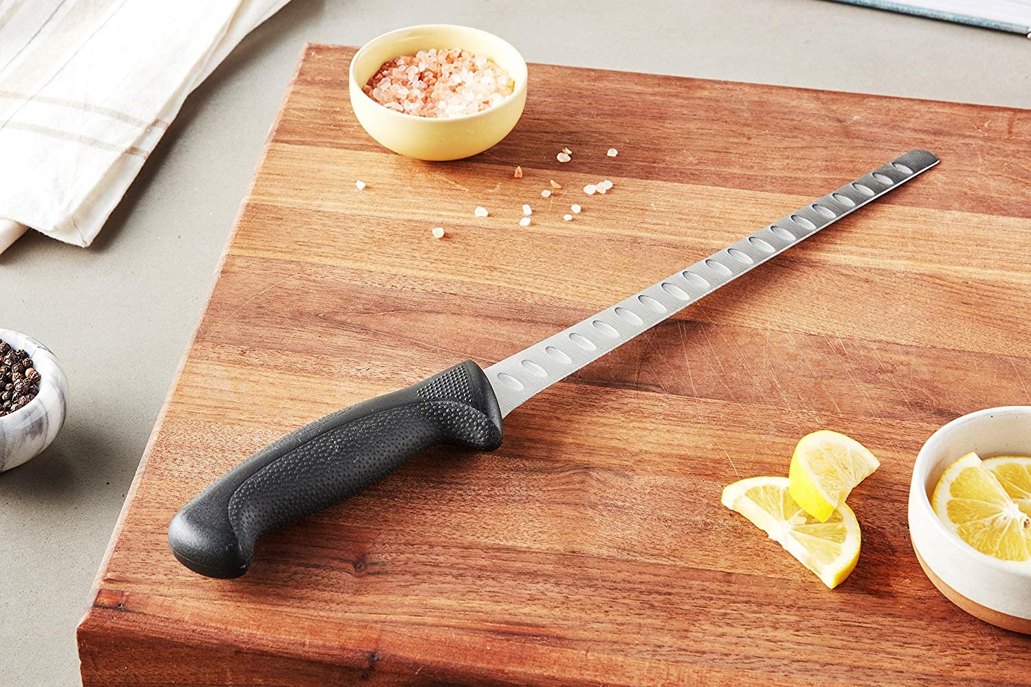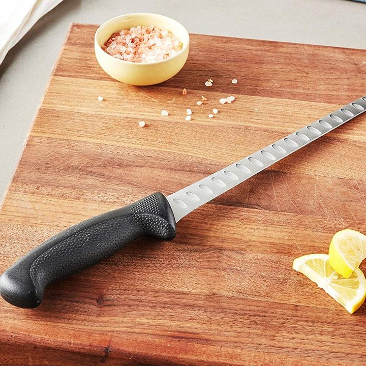 For those who are looking for top performance at an unbelievable price, the Mercer Culinary Millenia Salmon Slicer will prove to be a new favorite in your kitchen drawer. Featuring a single piece of high-carbon Japanese steel, this knife has an ergonomic handle with textured finger points for better slip protection.